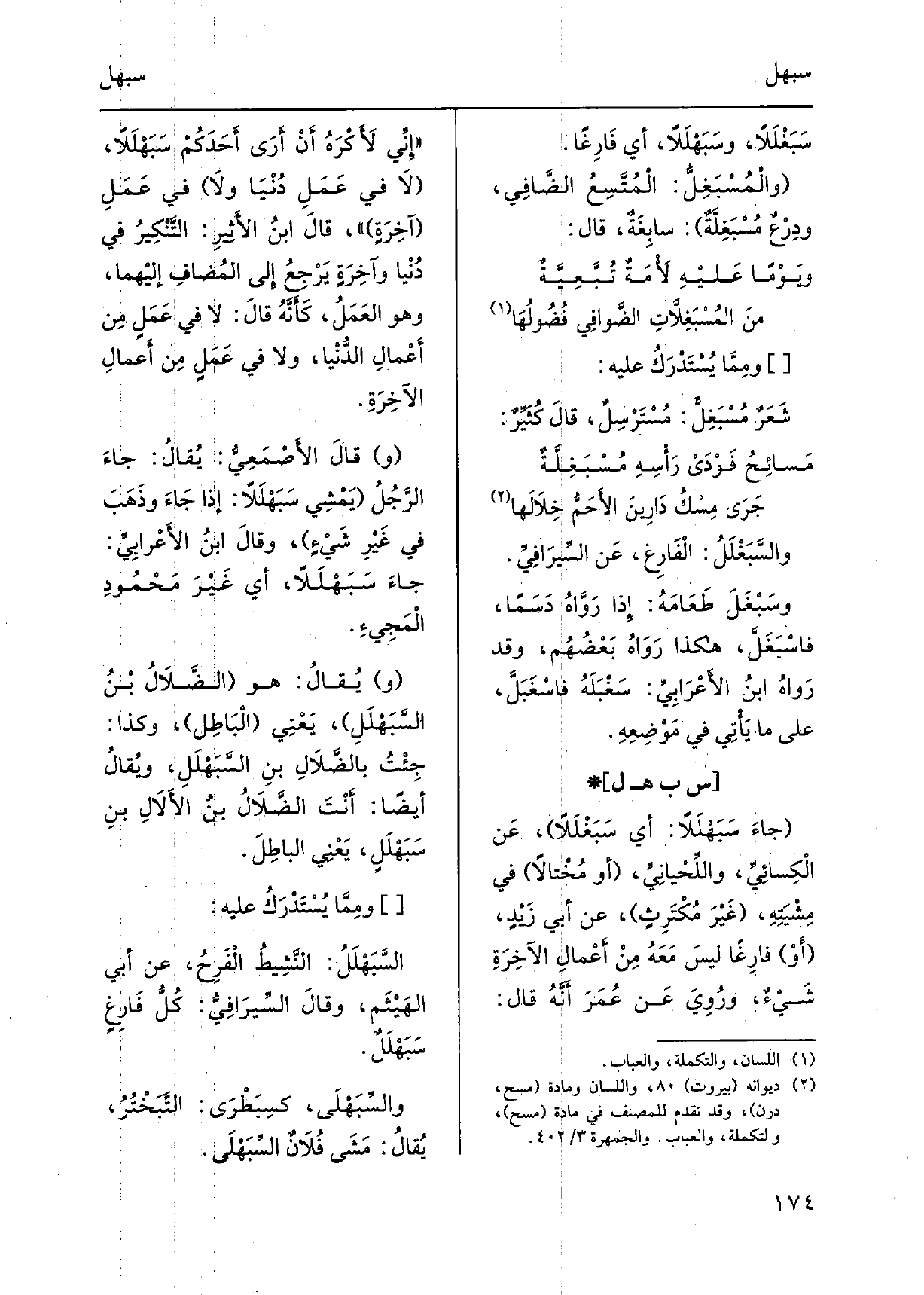جاءَ سَبَهْلَلاً: اي سَبَغْلَلاً، عَن الكِسائِيِّ، واللِّحْيانِيِّ، أَو مُخْتالاً فِي مِشْيَتِهِ، غَيْرَ مُكْتَرِثٍ، عَن أبي زَيْدٍ، أَوْ فارِغاً ليسَ مَعَهُ مِنْ أَعْمالِ الآخِرَةِ شَيْءٌ، ورُوِيَ عَن عُمَرَ أَنَّهُ قَالَ: إِنِّي لأَكْرَهُ أَنْ أَرَى أَحَدَكُمْ سَبَهْلَلاً، لاَ فِي عَمَلِ دُنْيَا ولاَ فِي عَمَلِ آخِرَةٍ، قالَ ابْنُ الأَثِيرِ: التّنْكِيرُ فِي دُنْيا وآخِرَةٍ يَرْجِعُ إِلَى المُضافِ إليْهما، وَهُوَ العَمَلُ، كَأَنَّهُ قالَ: لَا فِي عَمَلٍ مِن أَعْمالِ الدُّنْيا، وَلَا فِي عَمَلٍ مِن أَعْمالِ الآخِرَةِ. وقالَ الأَصْمَعِيُّ: يُقالُ: جاءَ الرَّجُلُ يَمْشِي سَبَهْلَلاً: إِذا جاءَ وذَهَبَ فِي غَيْرِ شَيْءٍ، وقالَ ابنُ الأَعرابِيِّ: جاءَ سَبَهْلَلاً، أَي غَيْرَ مَحْمُودِ المَجِيءِ. ويُقالُ: هُوَ الضَّلاَلُ بْنُ السَّبَهْلَلِ، يَعْنِي الْبَاطِل، وَكَذَا: جِئْتُ بالضَّلالِ بنِ السَّبَهْلَلِ، ويُقالُ أَيْضا: أَنْتَ الضَّلاَلُ بنُ الأَلاَلِ بنِ سَبَهْلَلٍ، يَعْنِي الباطِلَ. وممّا يُسْتَدْرَكُ عَلَيْهِ: السَّبَهْلَلُ: النَّشِيطُ الْفَرِحُ، عَن أبي الهَيْثَم، وقالَ السِّيرافِيُّ: كُلُّ فَارِغٍ سَبَهْلَلٌ. والسِّبَهْلَى، كسِبَطْرَى: التَّبَخْتُرُ، يُقالُ: مَشَى فُلاَنٌ السِّبَهْلَى.