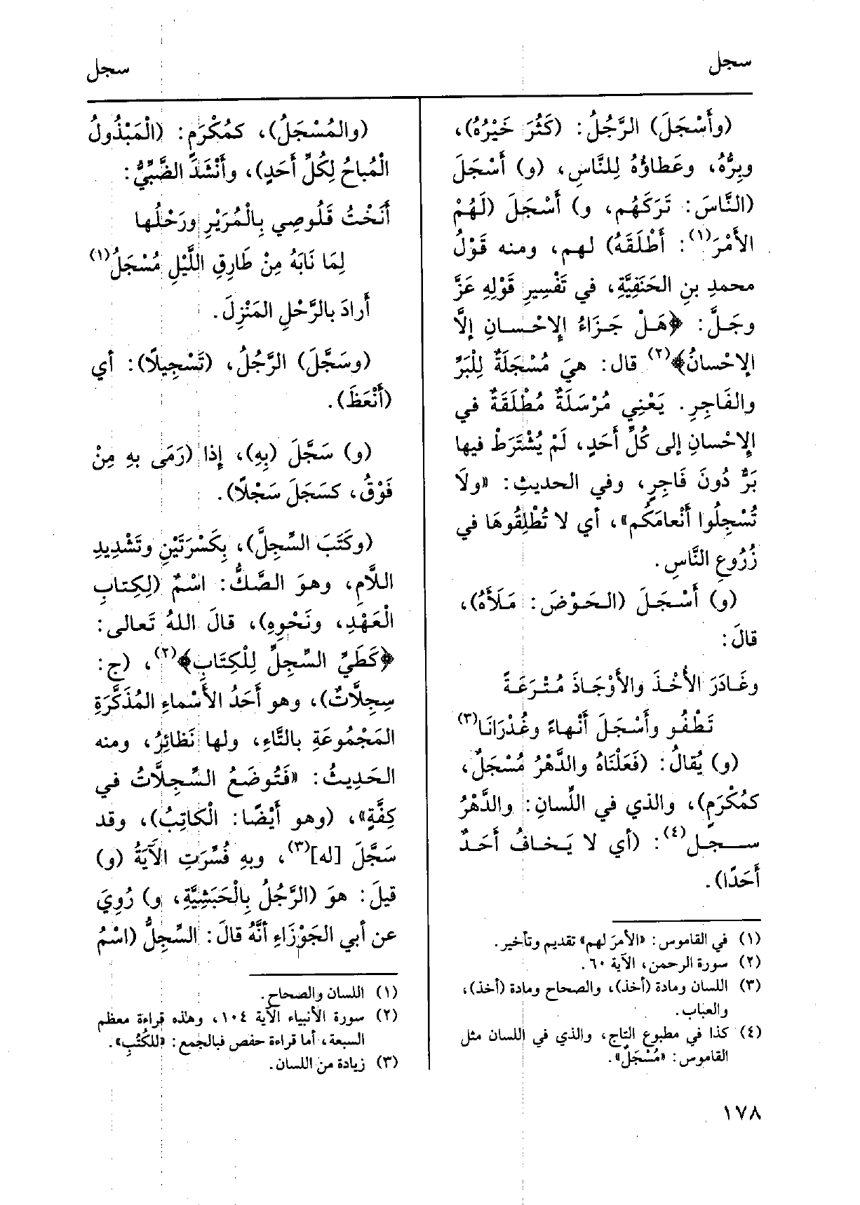 أَرادَ بالرَّحْلِ المَنْزِلَ. وسَجَّلَ الرَّجُلُ، تَسْجِيلاً: أَي أَنْعَظَ. وسَجَّلَ بِهِ، إِذا رَمَى بهِ مِنْ فَوْقُ، كسَجَلَ سَجْلاً. وكَتَبَ السِّجِلَّ، بِكَسْرَتَيْنِ وتَشْدِيدِ اللاَّمِ، وهوَ الصَّكُّ: اسْمٌ لِكِتابِ الْعَهْدِ، ونَحْوِهِ، قالَ اللهُ تَعالى: كَطَيِّ السِّجِلِّ لِلْكِتَابِ، ج: سِجِلاَّتٌ، وَهُوَ أَحَدُ الأَسْماءِ المُذَكَّرَةِ المَجْمُوعَةِ بالتَّاءِ، وَلها نَظائِرُ، وَمِنْه الحَدِيثِ: فَتُوضَعُ السِّجِلاَّتُ فِي كِفَّةٍ، وَهُوَ أَيْضاً: الْكاتِبُ، وَقد سَجَّلَ لَهُ، وبهِ فُسِّرَتِ الآيَةُ وقيلَ: هوَ الرَّجُلُ بِالْحَبَشيَّةِ، ورُوِيَ عَن أبي الجَوْزَاءِ أنَّهُ قالَ: السِّجِلُّ اسْمُ