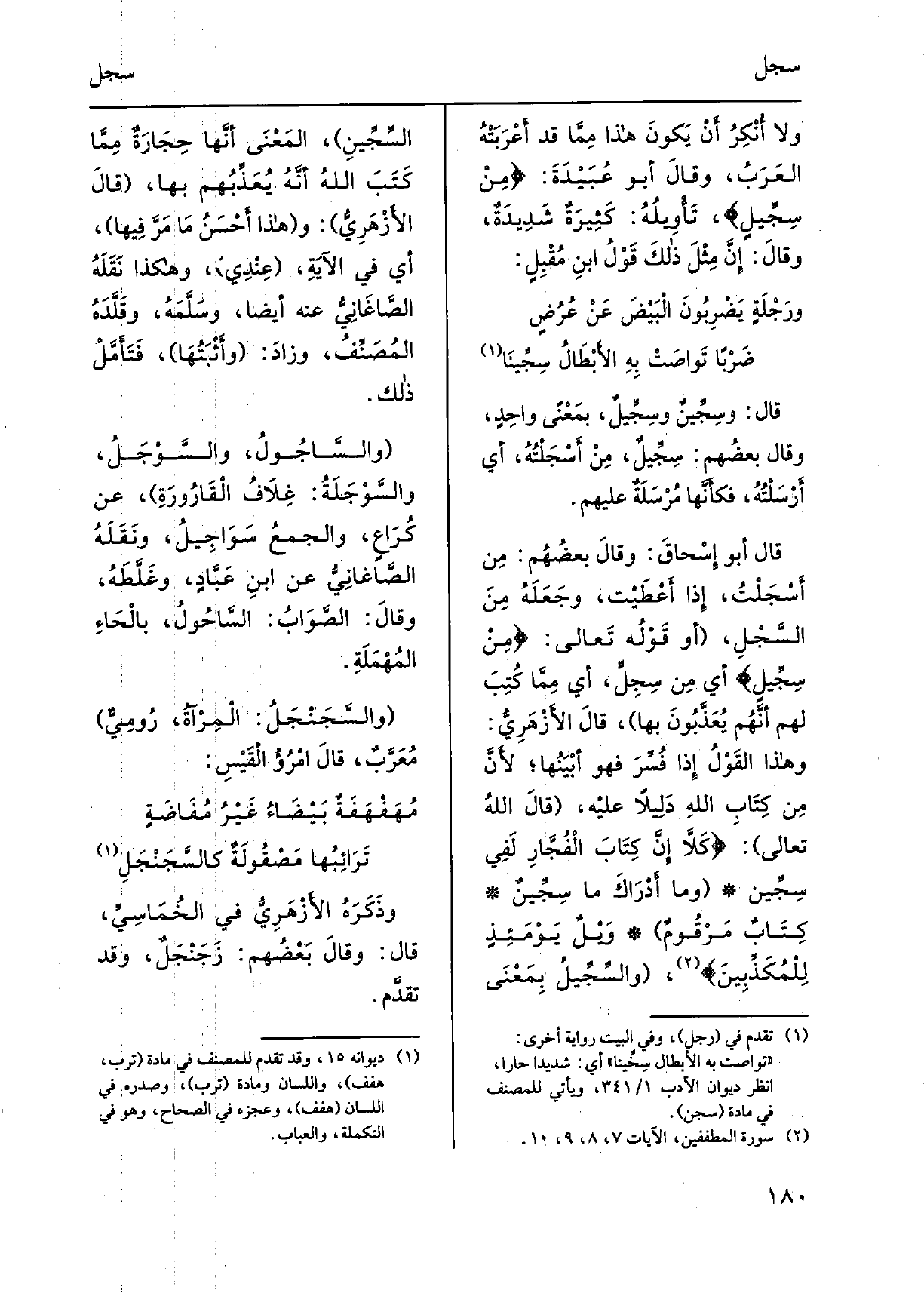 وَلَا أُنْكِرُ أَنْ يَكونَ هَذَا مِمَّا قد أَعْرَبَتْهُ العَرَبُ، وقالَ أَبُو عُبَيْدَةَ: مِنْ سِجِّيلٍ، تَأْوِيلُهُ: كَثِيرَةٌ شَدِيدَةٌ، وقالَ: إِنَّ مِثْلَ ذلكَ قَوْلُ ابنِ مُقْبِلٍ: