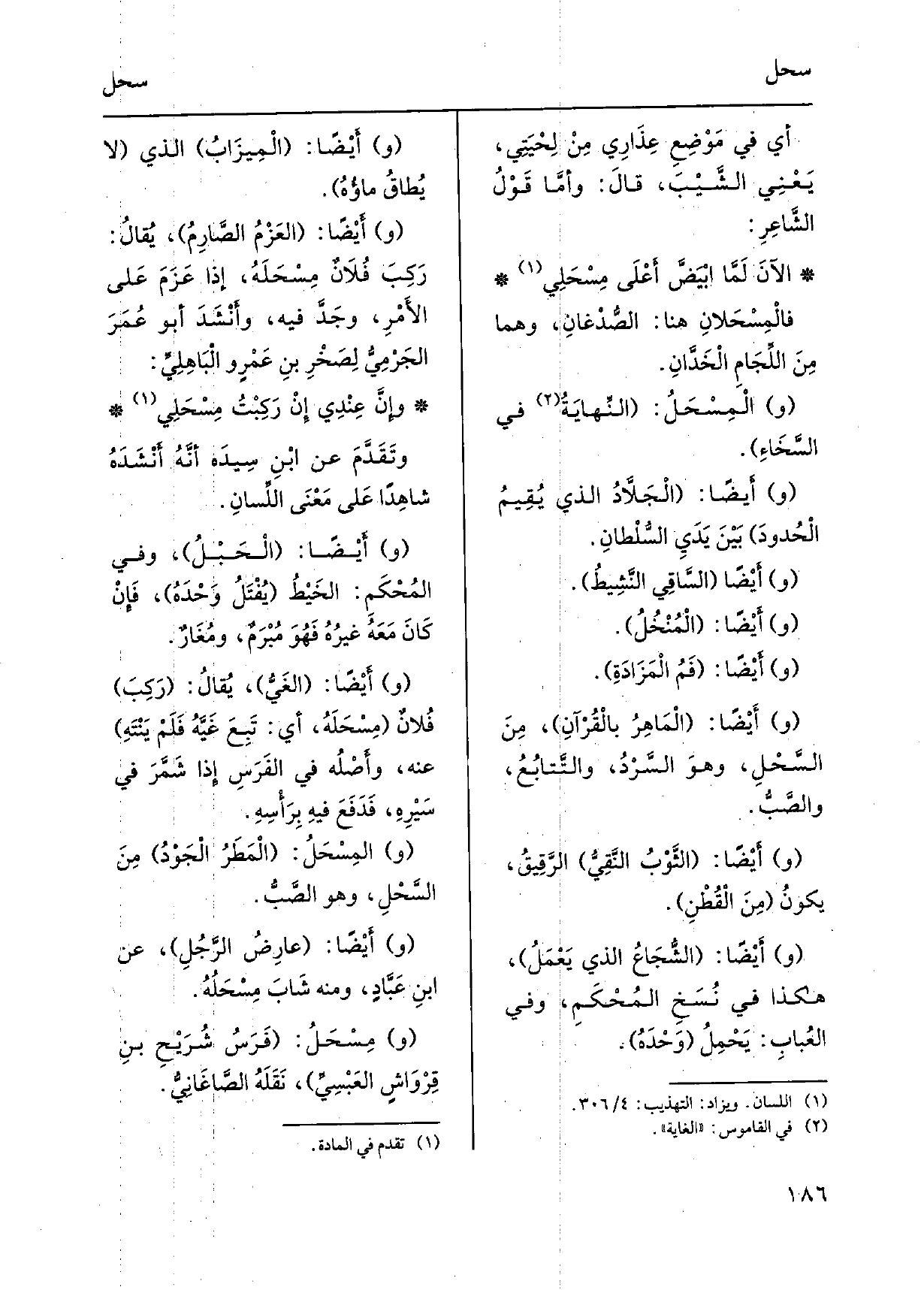 أَي فِي مَوْضِعِ عِذَاريِ مِنْ لِحْيَتِي، يَعْنِي الشَّيْبَ، قالَ: وأمَّا قَوْلُ الشَّاعِرِ: الآنَ لَمَّا ابْيَضَّ أَعْلَى مِسْحَلِي فالمِسْحَلانِ هُنَا: الصُّدْغانِ، وهما مِنَ اللِّجَامِ الْخَدَّانِ. والْمِسْحَلُ: النِّهايَةُ فِي السَّخَاءِ. وأَيْضاً: الْجَلاَّدُ الَّذِي يُقِيمُ الْحُدودَ بَيْنَ يَدَيِ السُّلْطانِ. وأَيْضَاً السَّاقِي النَّشِيطُ. وأَيْضَاً المُنْخُلُ. وأَيْضَاً: فَمُ المَزَادَةِ. وأَيْضاً: الْمَاهِرُ بالْقُرْآنِ، مِنَ السَّحْلِ، وهوَ السَّرْدُ، والتَّتابُعُ، والصَّبُّ. وأَيْضَاً: الثَّوبُ النَّقِيُّ الرَّقِيقُ، يكونُ مِنَ الْقُطْنِ. وأَيْضاً: الشُّجاعُ الَّذِي يَعْمَلُ، هَكَذَا فِي نُسَخِ المُحْكَمِ، وَفِي العُبابِ: يَحْمِلُ وَحْدَهُ. وأَيْضاً: الْمِيزَابُ الَّذِي لَا يُطاقُ ماؤُهُ. وأَيْضاً: العَزْمُ الصَّارِمُ، يُقالُ: رَكِبَ فُلاَنٌ مِسْحَلَهُ، إِذا عَزَمَ على الأَمْرِ، وجَدَّ فِيهِ، وأَنْشَدَ أَبُو عُمَرَ الجَرْمِيُّ لِصَخْرِ بنِ عَمْرٍ والْبَاهِلِيِّ: وإِنَّ عِنْدِي إِنْ رَكِبْتُ مِسْحَلِي وتَقَدَّمَ عَن ابْنِ سِيدَه أَنَّهُ أَنْشَدَهُ شاهِداً عَلى مَعْنَى اللِّسانِ. وأَيْضَاً: الْحَبْلُ، وَفِي المُحْكَم: الخَيْطُ يُفْتَلُ وَحْدَهُ، فَإِنْ كانَ مَعَهُ غيرُهُ فَهُوَ مُبْرَمٌ، ومُغَارٌ. وأَيْضاً: الغَيُّ، يُقالُ: رَكِبَ فُلانٌ مِسْحَلَهُ، أَي: تَبِعَ غَيَّهُ فَلَمْ يَنْتَهِ عَنهُ، وأَصْلُه فِي الفَرَسِ إِذا شَمَّرَ فِي سَيْرِهِ، فَدَفَعَ فيهِ بِرَأْسِهِ. والمسْحَلُ: الْمَطَرُ الْجَوْدُ منَ السَّحْلِ، وَهُوَ الصَّبُّ. وأَيْضاً: عارِضُ الرَّجُلِ، عَن ابنِ عَبَّادٍ، وَمِنْه شَابَ مِسْحَلُهُ. ومِسْحَلُ: فَرَسُ شُرَيْحِ بنِ قِرْوَاشٍ العَبْسِيِّ، نَقَلَهُ الصّاغَانِيُّ.