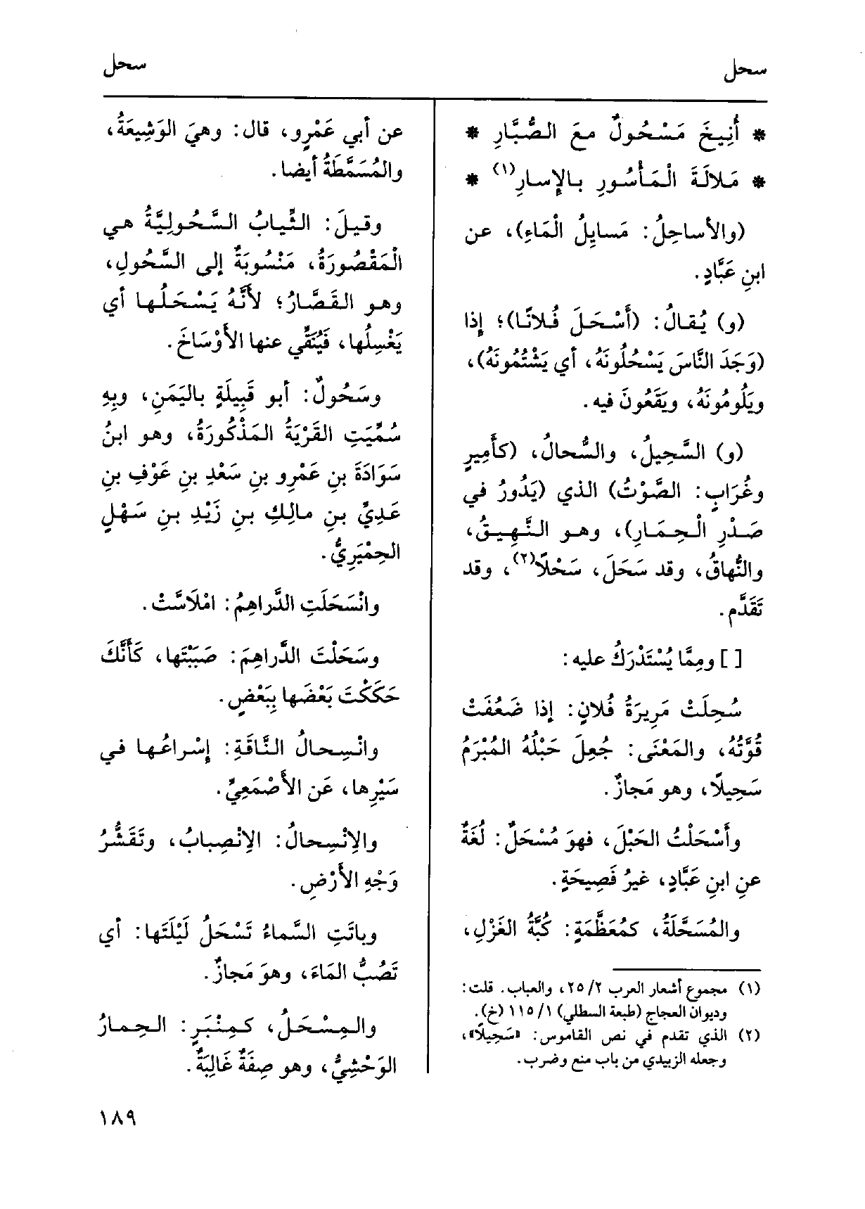 أُنِيخَ مَسْحُولٌ معَ الصُّبَّارِ مَلالَةَ الْمَأْسُورِ بالإسارِ والأَساحِلُ: مَسايِلُ الْماءِ، عَن ابنِ عَبَّادٍ. ويُقالُ: أَسْحَلَ فُلاناً، إِذا وَجَدَ النَّاسَ يَسْحُلُونَهُ، أَي يَشْتُمُونَهُ، ويَلُِومُونَهُ، ويَقَعُونَ فِيهِ. والسَّحِيلُ، والسُّحالُ، كأَمِيرٍ وغُرَابٍ: الصَّوْتُ الَّذِي يَدُورُ فِي صَدْرِ الحِمَارِ، وَهُوَ النَّهِيقُ، والنُّهاقٌ، وَقد سَحَلَ، سَحْلاً، وَقد تَقَدَّم. وممّا يُسْتَدْرَكُ عَلَيْهِ: سُحِلَتْ مَرِيرَةُ فُلانٍ: إِذا ضَعُفَتْ قُوَّتُه، والمَعْنَى جُعِلَ حَبْلُهُ المُبْرَمُ سَحِيلاً، وَهُوَ مَجازٌ. وأَسْحَلْتُ الحَبْلَ، فهوَ مُسْحَلٌ: لُغَةٌ عنِ ابنِ عَبَّادٍ، غيرُ فَصِيحَةٍ. والمُسَحَّلَةُ، كمُعَظَّمَةٍ: كُبَّةُ الغَزْلِ، عَن أبي عَمْرٍ و، قَالَ: وهيَ الوَشِيعَةُ، والمُسَمَّطَةُ أَيْضا. وقيلَ: الثِّيابُ السَّحُولِيَّةُ هِيَ الْمَقْصُورَةُ، مَنْسُوبَةٌ إِلَى السَّحُولِ، وَهُوَ القَصَّارُ، لأَنَّهُ يَسْحَلُها أَي يَغْسِلُها، فَيُنَقِّي عَنْهَا الأَوْساخَ. وسَحُولٌ: أَبُو قَبِيلَةٍ باليَمَنِ، وبِهِ سُمِّيَتِ القَرْيَةُ المَذْكُورَةُ، وَهُوَ ابنُ سَوَادَةَ بنِ عَمْرِو بنِ سَعْدِ بنِ عَوْفِ بنِ عَدِيِّ بنِ مالِكِ بنِ زَيْدِ بنِ سَهْلٍ الحِمْيَرِيُّ. وانْسَحَلَتْ الدَّراهِمُ: امْلاَسَّتْ. وسَحَلْتَ الدَّراهِمَ: صَبَبْتَها، كَأنَّكَ حَكَكْتَ بَعْضَها بِبَعْضٍ. وانٍ سِحالُ النَّاقَةِ: إِسْراعُها فِي سَيْرِها، عَن الأصْمَعِيِّ. والانْسِحالُ: الانْصِبابُ، وتَقَشُّرُ وَجْهِ الأَرْضِ. وباتَتِ السَّماءُ تَسْحَلُ لَيْلَتَها: أَي تَصُبُّ المَاءَ، وهوَ مَجازٌ.