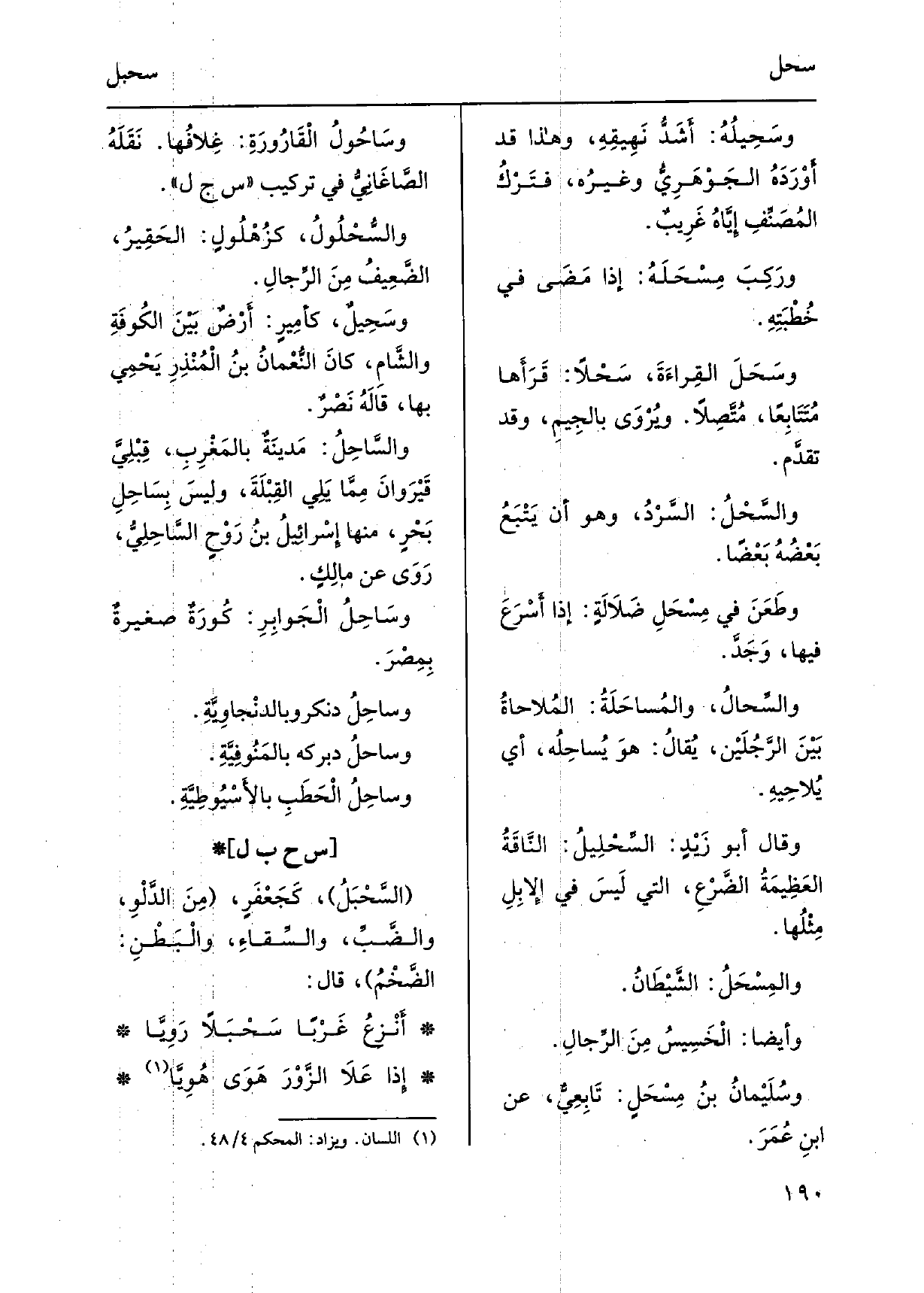 وسَحِيلُهُ: أَشَدُّ نَهِيقِهِ، وَهَذَا قد أَوْرَدَهُ الجَوْهَرِيُّ وغيرُه، فتَرْكُ المُصَنِّفِ إِيَّاهُ غَرِيبٌ. ورَكِبَ مِسْحَلَهُ: إِذا مَضَى فِي خُطْبَتِهِ. وسَحَلَ القِراءَةَ، سَحْلاً: قَرَأَها مُتَتَابِعاً، مُتَّصِلاً. ويُرْوَى بالجِيمِ، وَقد تقدَّم. والسَّحْلُ: السَّرْدُ، وَهُوَ أَن يَتْبَعُ بَعْضُهُ بَعْضاً. وطَعَنَ فِي مِسْحَلِ ضَلاَلَةٍ: إِذا أَسْرَعَ فِيهَا، وَجَدَّ. والسَّحالُ، والمُساحَلَةُ: المُلاحاةُ بَيْنَ الرَّجُلَيْنِ، يقالُ: هوَ يُساحِلُه، أَي يُلاحِيهِ. وَقَالَ أَبُو زَيْدٍ: السِّحْلِيل: النَّاقَةُ العَظِيمَةُ الضَّرْعِ، الَّتِي لَيْسَ فِي الإِبِلِ مِثْلُها. والمِسْحَلُ: الشَّيْطَانُ. وَأَيْضًا الْخَسِيسُ مِنَ الرِّجالِ. وسُلَيْمانُ بنُ مِسْحَلٍ: تَابِعِيٌّ، عَن ابنِ عُمَرَ. وسَاحُولُ الْقَارُورَةِ: غِلافُها. نَقَلَهُ الصّاغَانِيُّ فِي تَركيب س ج ل. والسُّحْلُولُ، كزُهْلُولٍ: الحَقِيرُ، الضَّعِيفُ مِنَ الرِّجالِ. وسَحِيلٌ، كأَمِيرٍ: أَرْضٌ بَيْنَ الكُوفَةِ)