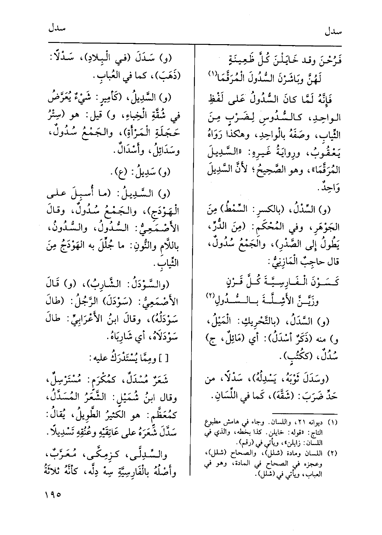 فَإِنَّهُ لَمَّا كانَ السُّدُولُ عَلى لَفْظِ الواحِدِ، كالسُّدُوسِ لِضَرْبٍ مِنَ الثِّيابِ، وصَفَهُ بالْواحِدِ، وَهَكَذَا رَواهُ يَعْقُوبُ، ورِوايَةُ غَيْرِهِ: السَّدِيلَ المُرَقَّمَا، وَهُوَ الصَّحِيحُ، لأَنَّ السَّدِيلَ وَاحِدٌ. والسِّدْلُ، بالكسرِ: السِّمْطُ مِنَ الجَوْهَرِ، وَفِي المُحْكَمِ: مِنَ الدُّرِّ، يَطُوٌ إِلى الصَّدْرِ، والجَمْعُ سُدُولٌ، قَالَ حاجِبٌ الْمَازِنِيُّ: