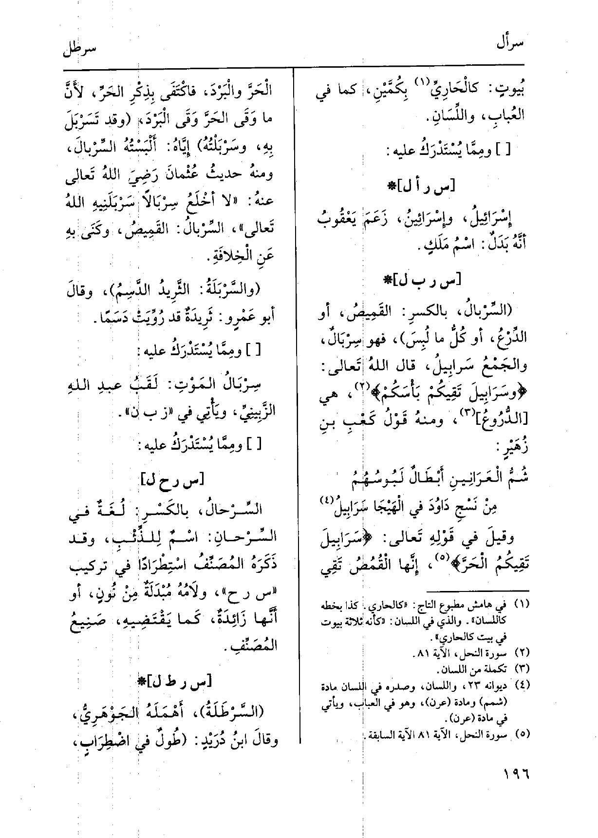 وقِيلَ فِي قَوْلِهِ تَعالى: سَرَابِيلَ تَقِيكُمُ الْحَرَّ، إِنَّها الْقُمُصُ تَقِي الْحَرَّ والْبَرْدَ، فاكْتَفَى بِذِكْرِ الحَرِّ، لأنَّ مَا وَقَى الحَرَّ وَقَى البَرْدَ، وَقد تَسَرْبَلَ بِهِ، وسَرْبَلتُهُ إِيَّاُه: أَلْبَسْتُهُ السِّرْبالَ، ومنهُ حديثُ عُثْمانَ رَضِيَ اللهُ تَعالى عَنهُ: لَا أَخْلَعُ سِرْبَالاً سَرْبَلَنِيهِ اللهُ تَعالى، السَّرْبالُ: القَمِيصُ وكَنَى بهِ عَنِ الْخِلافَةِ. والسَّرْبَلَةُ: الثَّرِيدُ الدَّسِمُ، وقالَ أَبُو عَمْرٍ و: ثَرِيدَةٌ قد رُوِّيَتْ دَسَماً. وممّا يُسْتَدْرَكُ عَلَيْهِ: سِرْبَالُ المَوْتِ: لَقَبُ عبدِ اللهِ الَّبِينِيِّ، ويَأْتِي فِي ز ب ن. وممّا يُسْتَدْرَكُ عَلَيْهِ: