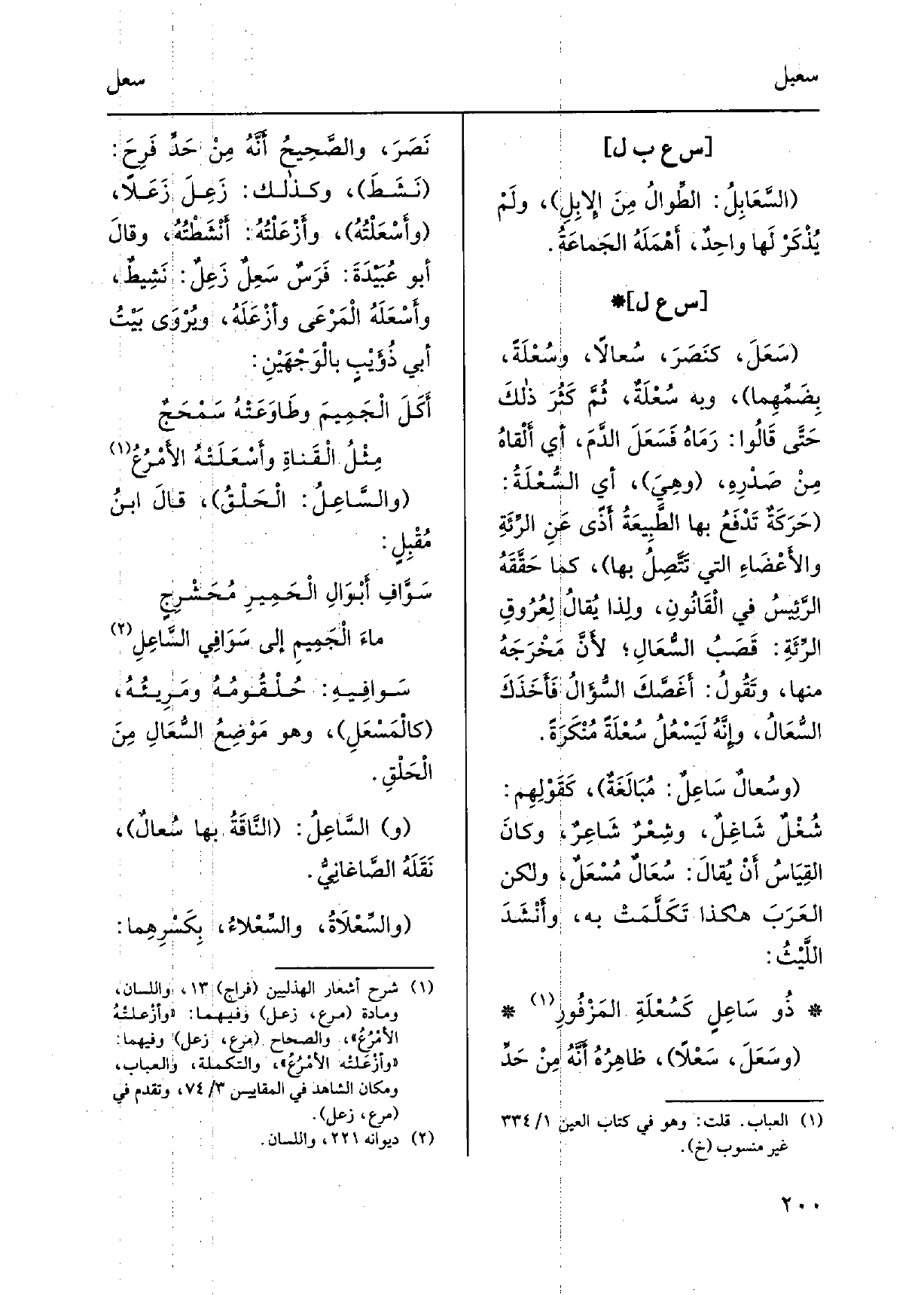 سَعَلَ كنَصَرَ، سُعالاً، وسُعْلَةً، بِضَمّهِما، وَبِه سُعْلَةٌ، ثُمَّ كَثُرَ ذلكَ حَتَّى قَالُوا: رَمَاهُ فَسَعَلَ الدَّمَ، أَي أَلْقَاهُ مِنْ صَدْرِهِ، وهِيَ، أَي السُّعْلَةُ: حَرَكَةٌ تَدْفَعُ بهَا الطَّبِيعَةُ أَذَىً عَنِ الرِّئَةِ والأَعْضَاءِ الَّتِي تَتَّصِلُ بهَا، كَمَا حَقَّقَهُ الرَّئِيسُ فِي الْقَانُونِ، ولِذا يُقالُ لِعُرُوقِ الرِّئةِ: قَصَبُ السُّعَالِ، لأَنَّ مَخْرَجَهُ مِنْهَا، وتَقُولُ: أَغَصَّكَ السُّؤَالُ فَأَخَذَكَ السُّعَالُ، وإِنَّهُ لَيَسْعُلُ سُعْلَةً مُنْكَرَةً. وسُعالٌ سَاعِلٌ: مُبالَغَةٌ، كَقَوْلِهِم: شُغْلٌ شَاغِلٌ، وشِعْرٌ شاعِرٌ، وكانَ القِيَاسُ أَنْ يُقالَ: سُعَالٌ مُسْعَلٌ، وَلَكِن العَرَبَ هَكَذَا تَكَلَّمَتْ بِهِ، وأَنْشَدَ اللَّيْثُ: ذُو سَاعِلٍ كَسُعْلَةِ المَزْفُورِ وسَعَلَ، سَعْلاً، ظاهِرُهُ أَنَّهُ مِنْ حَدِّ نَصَرَ، والصَّحِيحُ أَنَّهُ مِنْ حَدِّ فَرِحَ: نَشَطَ، وكذلكَ: زَعِلَ زَعَلاً، وأَسْعَلْتُهُ، وأَزْعَلْتُهُ: أَنْشَطْتُهُ، وقالَ أَبُو عُبَيْدَةَ: فَرَسٌ سَعِلٌ زَعِلٌ: نَشِيطٌ، وأَسْعَلَهُ الْمَرْعَى واَزْعَلَهُ، ويُرْوَى بَيْتُ أبي ذُؤَيْبٍ بالوَجْهَيْنِ: