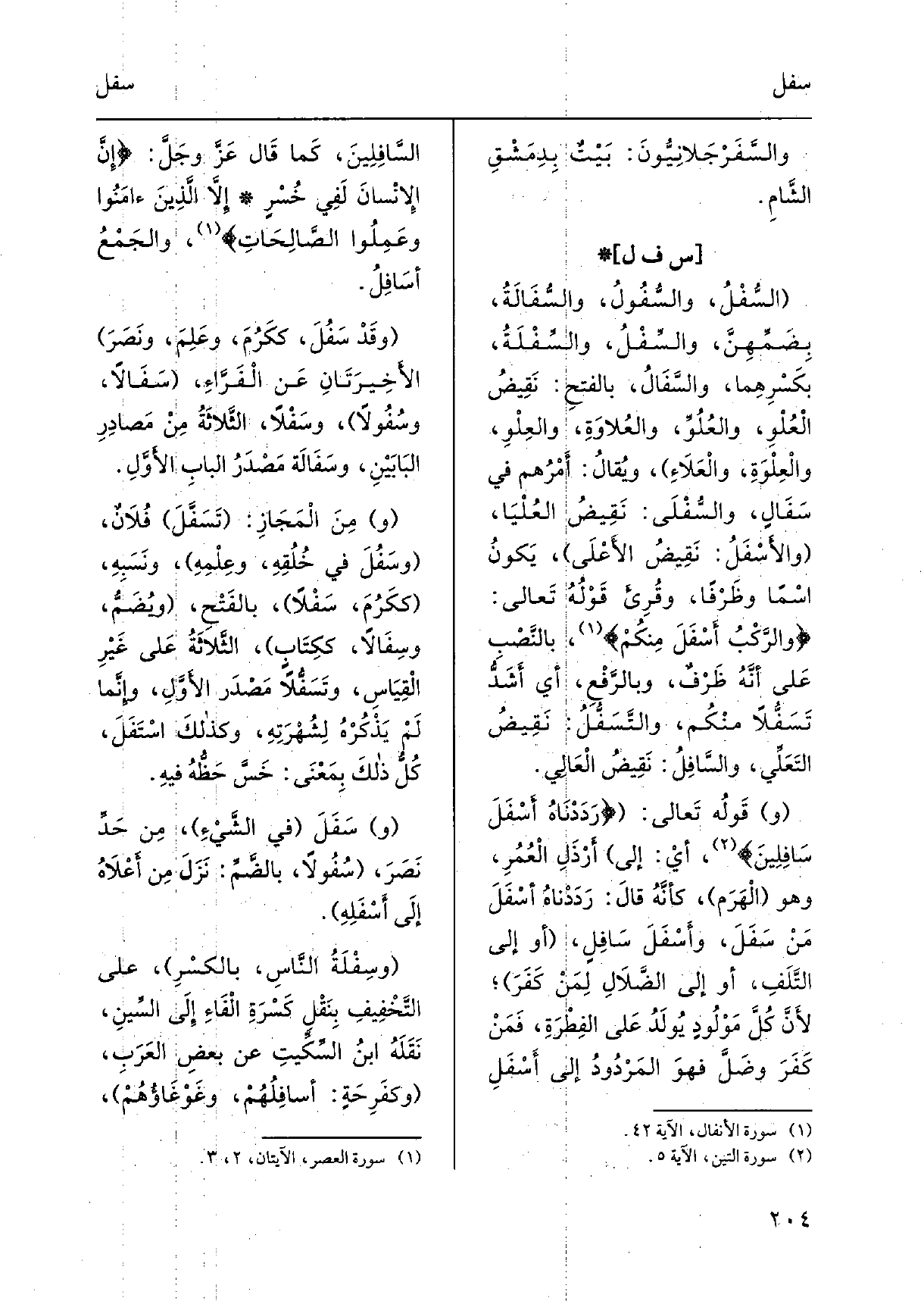 السُّفْلُ، والسُّفُولُ، والسَّفَالَةُ، بِضَمِّهِنَّ، والسِّفْلُ، والسِّفْلَةُ، الْعُلْوِ، والعُلُوِّ، والعُلاوَةِ، والعِلْوِ، والْعِلْوَةِ، والْعَلاَءِ، ويُقالُ: أَمْرُهم فِي سَفَالٍ، والسُّفْلَى: نَقِيضُ العُلْيَا، والأَسْفَلُ: نَقَيضُ الأَعْلَى، يَكُونُ اسْماً وظَرْفاً، وقُرَِ قَوْلُهُ تَعالى: والرَّكْبِ أَسْفَلَ مِنكُم، بالنَّصْبِ عَلى أنَّهُ ظَرْفٌ، وبالرَّفْعِ، أَي أَشَدُّ تَسَفُّلاً منْكُمٍ، والتَّسَفُّلُ: نَقِيضُ التَّعَلِّي، والسَّافِلُ: نَقِيضُ الْعَالِي. وقَوْلُه تَعَالى: رَدَدْنَاهُ أَسْفَلَ سَافِلِينَ، أَي إِلَى أَرْذَلِ الْعُمرِ، وَهُوَ الهَرَم، كأنَّهُ قالَ: رَدَدْناهُ أسْفَلَ مَنْ سَفَلَ، وأَسْفَلَ سَافِلٍ، أَو إِلَى التَّلَفَ، أَو إِلَى الضَّلالِ لِمَنْ كَفَرَ، لأَنَّ كُلَّ مَوْلُودٍ يُولَدُ عَلى الفِطْرَةِ، فَمَنْ كَفَرَ وضَلَّ فهوَ المَرْدُودُ إِلَى أَسْفَلِ السَّافِلِينَ، كَما قالَ عَزَّ وَجَلَّ: إنَّ الإِنْسانَ لَفِي خُسْرٍ، إِلاَّ الذِين ءامَنُوا وعَمِلُوا الصَّالِحاتِ والجَمْعُ أَسافِلُ. وقَدْ سَفُلَ، ككَرُمَ، وعَلِمَ، ونَصَرَ الأَخِيرَتَانِ عَن الْفَرَّاءِ، سَفَالاً، وسُفُولاً، وسَفْلاً، الثّلاثَةُ مِنْ مَصادِرِ البَابَيْنِ، وسَفَالَة مَصْدَرُ البابِ الأَوَّل. ومِنَ الْمَجازِ: تَسَفََّ فُلاَنٌ، وسَفُلَ فِي خُلُقِهِ، وعِلْمِهِ، ونَسَبِهِ، ككَرُمَ، سَفْلاً، بالفَتْحِ، ويُضَمُّ، وسِفالاً، ككِتَابٍ، الثَّلاثَةُ عَلى غَيْرِ الْقِيَاسِ، وتَسَفُّلاً مَصْدَر الأَوَّلِ، وإِنَّما لَمْ يَذْكُرْهُ لِشُهْرَتِهِ، وكذلكَ استَفَلَ، كُلُّ ذلكَ بِمَعْنَى: خَسّ حَظُّهُ فيهِ. وسَفَلَ فِي الشَّيْءِ، مِن حَدِّ نَصَرَ، سُفُولاً، بالضَّمِّ: نَزَلَ مِن أَعْلاَهُ إِلَى أَسْفَلِهِ. وسِفْلَةُ النَّاسِ، بالكسْرِ، على التَّخْفِيفِ بِنَقْلِ كَسْرَةِ الْفاءِ إِلَى السِّينِ، نَقَلَهُ ابنُ السِّكِّيتِ عَن بعضِ العَرَبِ، وكفَرِحَةٍ: أسافِلُهُمْ، وغَوْغَاؤُهُمْ،
