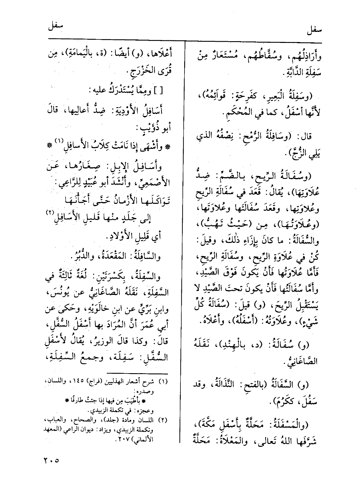 وممّا يُسْتَدْرَكُ عَلَيْهِ: أَسَافِلُ الأَوْدِيَةِ: ضِدُّ أَعالِيها، قالَ أَبُو ذُؤَيْبٍ: وأَشْهَى إِذا نَامَتْ كِلاَبُ الأَسافِلِ وأَسَافِلُ الإِبِلِ: صِغَارُها، عَنْ الأَصْمَعِيِّ، وأَنْشَدَ أَبُو عُبَيْدٍ لِلرَّاعِي: