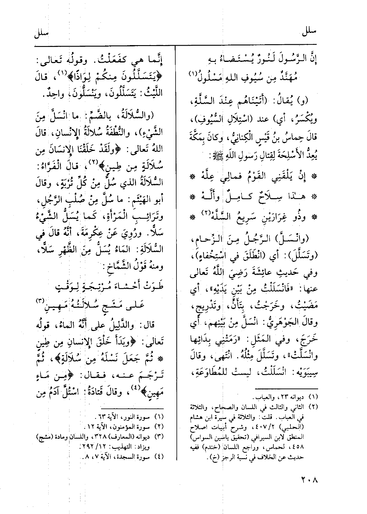 ويُقالُ: أَتَيْنَاهُم عِنْدَ} السَّلَّةِ، ويُكْسَرُ، أَي عِنْد {اسْتِلالِ السُّيُوفِ، قالَ حِماسُ بنُ قَيْسٍ الْكِنانِيُّ، وكانَ بِمَكَّةَ يُعِدُّ الأَسْلِحِةَ لِقِتالِ رَسُولِ اللهِ صَلَّى اللهُ عَلَيه وسَلَّم: إِنْ يَلْقَنِي القَوْمُ فمالِي عِلَّهْ هَذَا سِلاحٌ كامِلٌ وأَلَّهْ وذُو غِرَارَيْنِ سَرِيعُ} السَّلَّهْ {وانْسَلَّ الرَّجُلُ مِنَ الزَِّحامِ،} وتَسَلَّلَ: أَي انْطَلَقَ فِي اسْتِخْفاءٍ، وَفِي حَدِيثِ عائِشَةَ رَضيَ اللهُ تَعالى عَنْهَا: {فَانْسَلَلْتُ مِنْ بَيْنِ يَدَيْهِ، أَي مَضَيْتُ، وخَرَجْتُ، بِتَأَنٍّ، وتَدْرِيج، وقالَ الجَوْهَرِيُّ:} انْسَلَّ مِنْ بَيْنِهم، أَي خَرَجَ، وَفِي المَثَلِ: رمَتْنِي بِدَائِها {وانْسَلَّتْ،} وتَسَلَّلَ مِثْلُهُ. انْتَهى، وقالَ سِيبَوَيْه: {انْسَلَلْتُ، ليستْ للمُطَاوَعَةِ، إِنَّما هِيَ كفَعَلْتُ. وقولُه تَعالى:} يَتَسَلَّلُونَ مِنكُمْ لِوَاذاً، قَالَ اللَّيْثُ: يَتَسَلَّلُونَ، {ويَنْسَلُّونَ، واحِدٌ.} والسُّلاَلَةُ، بالضَّمِّ: مَا {انْسَلّ مِنَ الشَّيْءَ، والنُّطْفَةُ} سُلاَلَةُ الإِنْسانِ، قالَ اللهُ تَعالى: ولَقَدْ خَلَقْنَا الإِنْسَانَ مِن سُلاَلَةٍ مِن طِينٍ، قالَ الْفَرَّاءُ: {السُّلاَلَةُ الَّذِي سُلّ مِنْ كُلِّ تُرْبَةٍ، وقالَ أَبُو الهَيْثَمِ: مَا} سُلِّ مِنْ صُلْبِ الرَّجُلِ، وتَرَائِبِ الْمَرْأَةِ، كَما {يُسَلُّ الشَّيءُ} سَلاً. ورُوِيَ عَنْ عِكْرِمَةَ، أنَّهُ قالَ فِي {السُّلاَلَةِ: المَاءُ يُسَلُّ منَ الظَّهْرِ سَلاًّ، ومنهُ قَوْلُ الشَّمّاخِ: