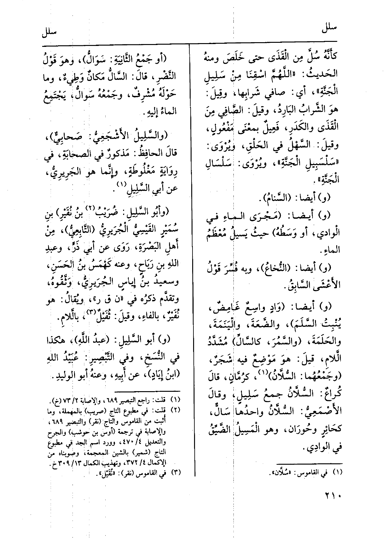 وَأَيْضًا: وَادٍ واسِعٌ غَامِضٌ، يُنْبِتُ السَّلَمَ، والضَّعَةَ، والْيَنَمَةَ، والحَلَمَةَ، والسَّمُرَ،} كالسَّالِّ مُشَدَّدُ الَّلامِ، قيلَ: هوَ مَوْضِعٌ فِيهِ شَجَرٌ، وجَمْعُهُما: {السُّلاَّنُ، كرُمَّانٍ، قالَ كُراعٌ: السُّلاَّنُ، كرُمَّانٍ، قالَ كُراعٌ: السُّلاَّنُ جمعُ سَلِيلٍ، وقالَ الأَصْمَعِيُّ: السُّلاَّنُ واحدُها سَالٌّ، كحَائِرٍ وحُوَرَان، وَهُوَ الْمَسِيلُ الضَّيِّقُ فِي الوادِي. أَو جَمْعُ الثَّانِيَةِ:} سَوَالُّ، وهوَ قَوْلُ النَّضْرِ، قالَ: {السَّالُّ مَكانٌ وَطِيءٌ، وَمَا حَوْلَهُ مُشْرِفٌ، وجَمْعُهُ سَوالٌّ، يَجْتَمِعُ الماءُ إليهِ.} والسَّلِيلُ الأَشْجَعِيُّ: صَحابِيٌّ، قالَ الحافِظُ: مَذكورٌ فِي الصحابَةِ، فِي رِوَايَةٍ مَغْلُوطَةٍ، وإِنَّما هُوَ الجَرِيرِيُّ، عَن أبي السَّلِيلِ. وأَبُو! السَّلِيلِ: ضُرَيْبُ بنُ نُقَيْرِ بنِ سُمَيْرٍ القَيْسِيُّ الْجُرَيرِيُّ التَّابِعِيُّ، مِنْ أهلِ البَصْرَةِ، رَوَى عَن أَبي ذَرٍّ، وعبدِ اللهِ بنِ رَبَاحٍ، وَعنهُ) كَهْمَسُ بنُ الحَسَنِ، وسعيدُ بنُ إِياسٍ الجُرَيرِيُّ، وَثَّقُوهُ، وتقدَّم ذكرُه فِي ن ق ر، ويُقالُ: هُوَ نُفَيْرٌ، بالفاءِ، وقيلَ: ثُفَيْلٌ، بالَّلامِ. وأَبو السَّلِيلِ: عبدُ اللَّهِ، هَكَذَا فِي النُّسَخِ، وَفِي التَّبْصِيرِ: عُبَيْدُ اللهِ ابنُ إِيَادٍ، عَن أَبِيهِ، وعنهُ أَبو الوليدِ.