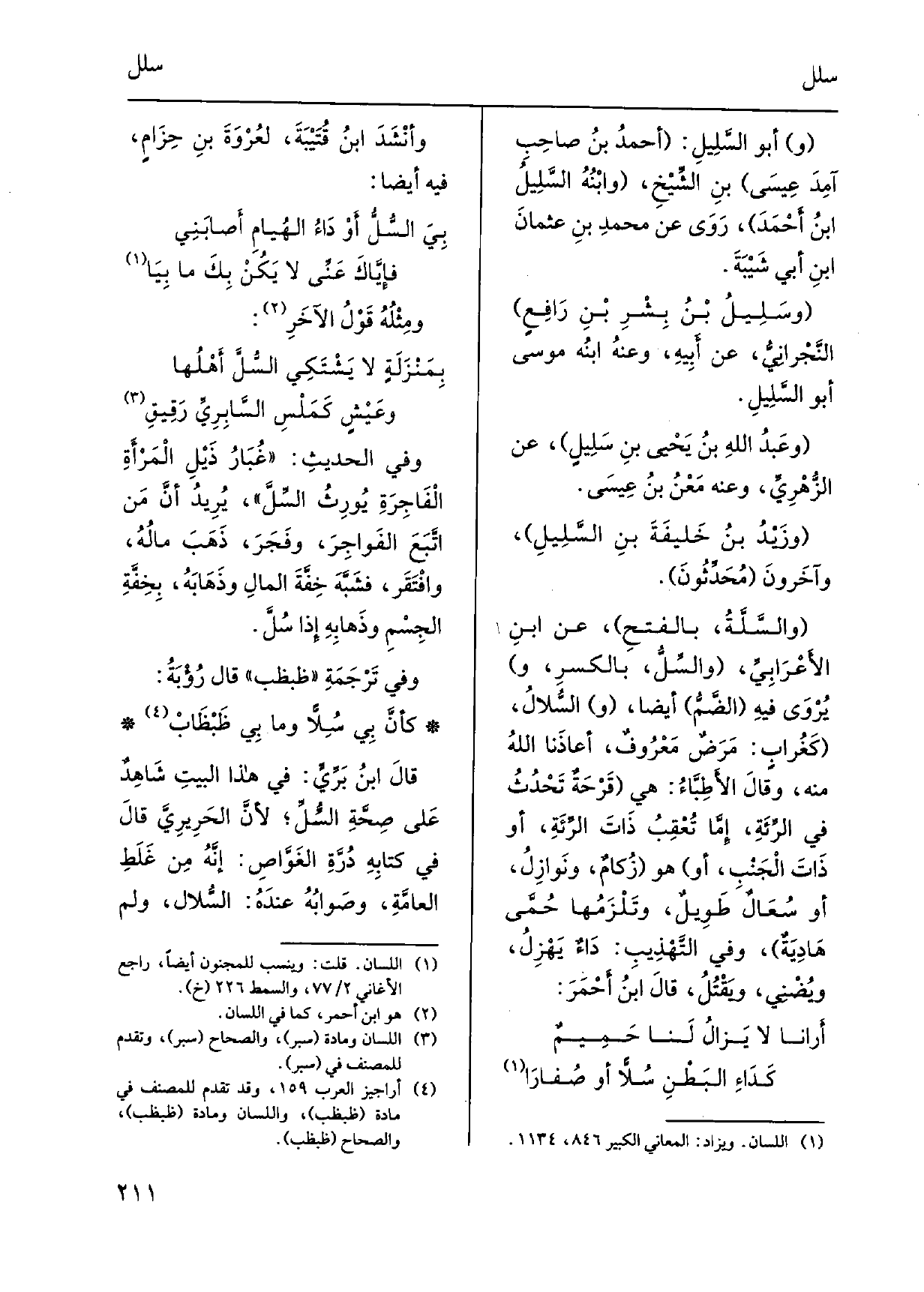 وَفِي الحديثِ: غُبَارُ ذَيْلِ الْمَرْأَةِ الْفَاجِرَةِ يُورِثُ السِّلَّ، يُرِيدُ أَنَّ مَنْ اتَّبَعَ الفَواجِرَ، وفَجَرَ، ذَهَبَ مالُهُ، وافْتَقَر، فشَبَّهَ خِفَّةَ المالِ وذَهَابَهُ، بِخِفَّةِ الجِسْمِ وذَهابِهِ إِذا} سُلَّ. وَفِي تَرْجَمَةِ ظبظب قَالَ رُؤْبَةُ: كأَنَّ بِي {سُلاًّ وَمَا بِي ظَبْظَابْ قالَ ابنُ بَرِّيٍّ: فِي هَذَا البيتِ شَاهِدٌ عَلى صِحَّةِ} السُّلِّ، لأنَّ الحَرِيرِيَّ قالَ فِي كتابِهِ دُرَّةِ الغَوَّاصِ: إِنَّهُ مِن غَلَطِ العامَّةِ، وصَوابُهُ عندَهُ:! السُّلال، وَلم