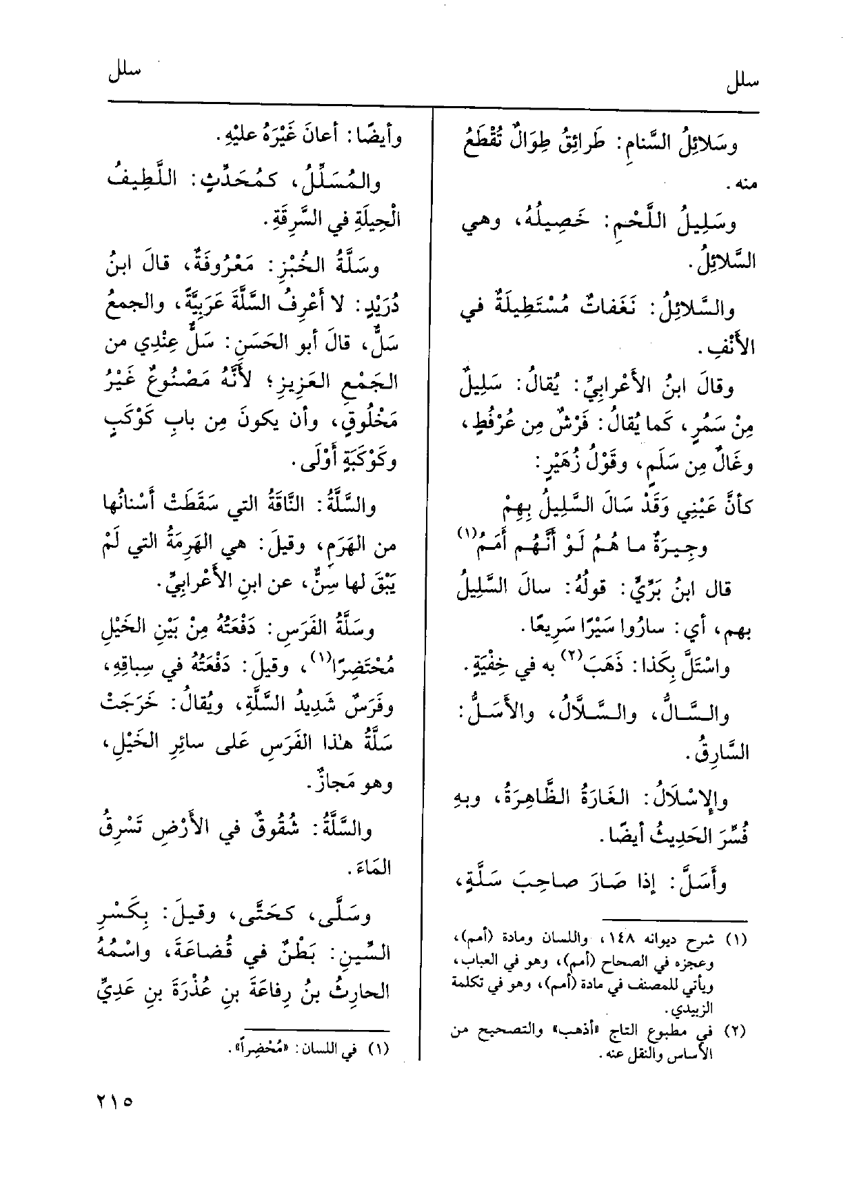 الحسَنِ: {سَلٌّ عِنْدِي من الجَمْعِ العَزِيزِ، لأَنَّهُ مَصْنُوعٌ غَيْرُ مَخْلُوقٍ، وَأَن يكونَ مِن بابِ كَوْكَبٍ وكَوْكَبَةٍ أَوْلَى.} والسَّلَّةُ: النَّاقَةُ الَّتِي سَقَطَتْ أَسْنانُها من الهَرَمِ، وقيلَ: هِيَ الهَرِمَةُ الَّتِي لَمْ يَبْقَ لَهَا سِنٌّ، عَن ابنِ الأَعْرابِيِّ. {وسَلَّةُ الفَرَسِ: دَفْعَتُهُ مِنْ بَيْنِ الخَيْلِ مُحْتَضِراً، وقيلَ: دَفْعَتُهُ فِي سِبَاقِهِ، وفَرَسٌ شَدِيدُ} السَّلَّةِ، ويُقالُ: خَرَجَتْ {سَلَّةُ هَذَا الفَرَسِ عَلى سائِرِ الخَيْلِ، وَهُوَ مَجازٌ. والسَّلَّةُ: شُقُوقٌ فِي الأَرضِ تَسْرِقُ المَاءَ.