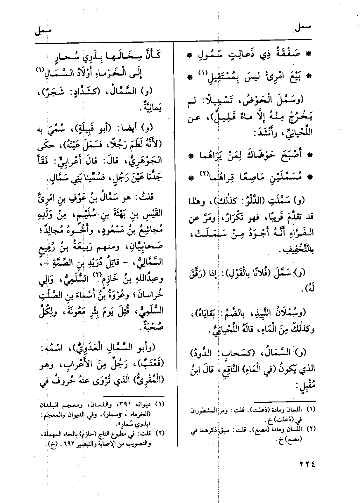 صفْقَةُ ذِي ذَعالِتٍ سَمُولٍ بَيْعَ امْرِئٍ ليسَ بِمُسْتَقِيلِ وسَمَّلَ الْحَوْضُ، تَسْمِيلاً: لم يَخْرُجْ مِنْهُ إلاَّ ماءٌ قَلِيلٌ، عَن اللِّحْيانِيِّ، وأَنْشَدَ: أصْبَحَ حَوْضَاكَ لِمَنْ يَرَاهُما مُسَمِّلَيْنِ مَاصِعاً قِراهُما وسَمَّلَتِ الدَّلْوُ: كَذَلِك، وَهَذَا قد تقدَّم قَريباً، فَهُوَ تَكْرَارٌ، ومَرَّ عَن الفَرَّاءِ أَنَّهُ أَجْوَدُ مِنْ سَمَلَتْ، بالتَّخْفِيفِ. وسَمَّلَ فُلاناً بالْقَوْلِ: إِذا رَقَّقَ لَهُ. وسُمْلانُ النَّبِيذِ، بالضَّمِّ: بَقايَاهُ، وكذلكَ مِنَ الْمَاءِ، قالَهُ اللِّحْيانِيُّ. والسَّمَالُ، كسَحابٍ: الدُّودُ الَّذِي يَكونُ فِي الْمَاءِ النَّاقِعِ، قالَ ابنُ مُقْبِلٍ: