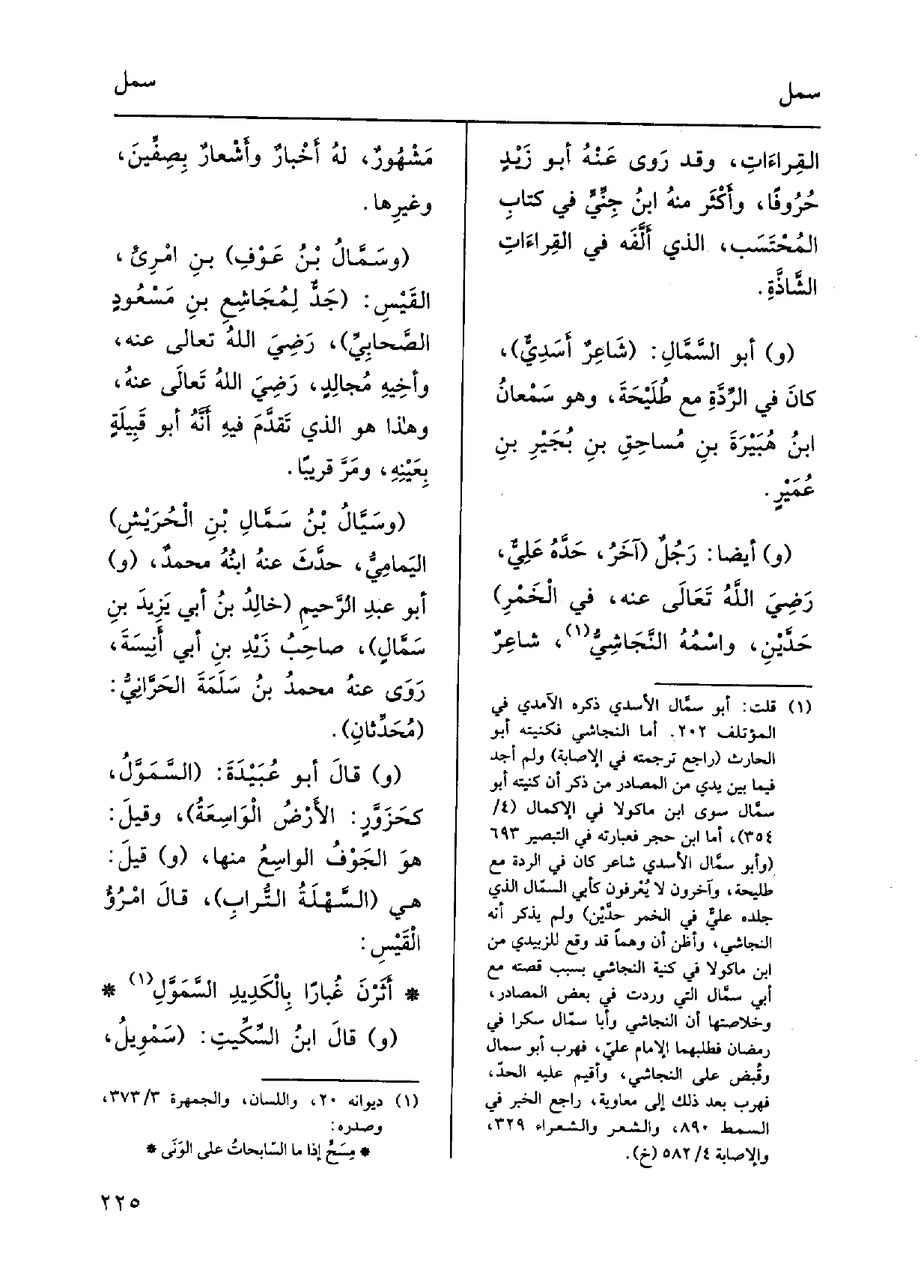 القِراءَاتِ، وَقد رَوى عَنْهُ أَبو زَيْدٍ حُرُوفاً، وأَكْثَر منهُ ابنُ جِنِّيٍّ فِي كتابِ المُحْتَسُب، الَّذِي أَلَّفَه فِي القِراءَاتِ الشَّاذَّةِ. وَأَبُو الشمالِ: شَاعِرٌ أَسَدِيٌّ، كانَ فِي الرِّدَّةِ مَعَ طُلَيْحَةَ، وَهُوَ سَمْعانُ ابنُ هُبَيْرَةُ بنِ مُساحِقِ بنِ بُجَيْرِ بنِ عُمَيْرٍ. وَأَيْضًا: رَجُلٌ آخَرُ، حَدَّهُ عَلِيٌّ، رَضِيَ اللهُ تَعَالَى عَنهُ، فِي الْخَمْرِ حَدَّيْنِ، واسْمُهُ النَّجَاشِيُّ، شاعِرٌ مَشْهُورٌ، لهُ أَخْبارٌ وأَشْعارٌ بِصِفِّينَ، وغيرِها.
