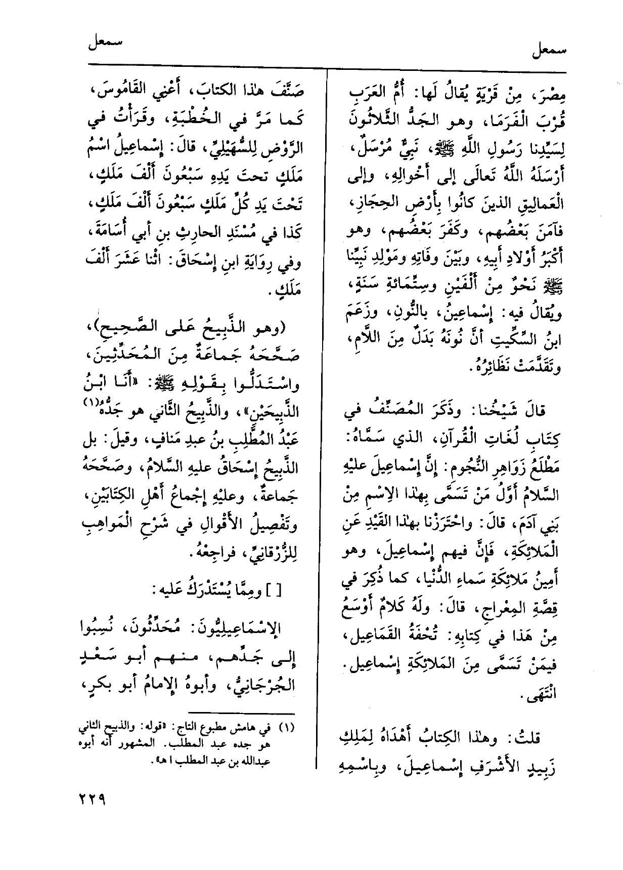 قالَ شَيْخُنا: وذَكَر المُصَنِّفُ فِي كِتَابِ لُغَاتِ الْقُرآنِ، الَّذِي سَمَّاهُ: مَطْلَعُ زَوَاهِرِ النُّجُومِ: إنَّ إِسْماعِيلَ عليْهِ السَّلامُ أَوَّلُ مَنْ تَسَمَّى بِهذا الاِسْمِ مِنْ بَنِي آدَمَ، قالَ: واحْتَرَزْنا بِهَذَا القَيْدِ عِنِ الْمَلائِكَةِ، فإِنَّ فيهم إِسْماعِيلَ، وَهُوَ أَمِينُ مَلائِكَةِ سَماءِ الدُّنْيا، كَمَا ذُكِرَ فِي قِصَّةِ المِعْراجِ، قالَ: ولَهُ كَلامٌ أَوْسَعُ مِنْ هَذا فِي كِتابِهِ: تَحْفَةُ القَمَاعِيل، فيمَنْ تَسَمَّى مِنَ المَلائِكَةِ إسْماعِيل. انْتَهَى.