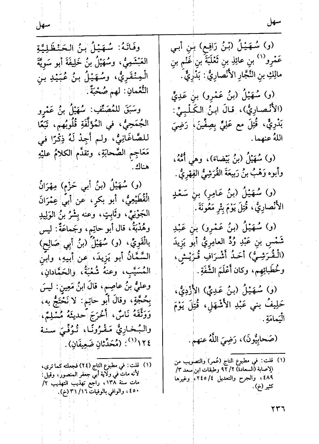 وسُهَيْلُ بنُ بَيْضاءَ، وَهِي أُمُّهُ، وَأَبوهُ وَهْبُ بنُ رَبيعَةَ القُرَشِيُّ الفِهْرِيُّ. وسُهَيْلُ بنُ عَامِرِ بنِ سَعْدٍ الأَنْصَارِيُّ، قُتِلَ يَوْمَ بِئْرِ مَعُونَةَ. وسُهَيْلُ بنُ عَمْرِو بنِ عَبْدِ شَمْسِ بنِ عَبْدِ وَدٍّ العامِرِيُّ أَبُو يَزِيدَ الْقُرَشِيُّ أَحَدُ أَشْرَافِ قُرَيْشٍ، وخُطَبائِهِم، وَكَانَ أَعْلَمَ الشَّفَةِ. وسُهَيْلُ بنُ عَدِيٍّ الأَزْدِيُّ، حَلِيفُ بني عَبْدِ الأَشْهَلِ، قُتِلَ يَوْمَ الْيَمامَةِ. صَحابِيُّونَ، رَضِيَ الله عَنْهُم. وفَاتُهُ: سُهَيْلُ بنُ الحَنْظَلِيَّةِ العَبْشَمِيُّ، وسُهَيْلُ بنُ خَلِيفَةَ أَبُو سُوِيَّةَ الْمِنْقَرِيُّ، وسُهَيْلُ بنُ عُبَيْدِ بنِ النُّعْمانِ: لَهُم صُحْبَةٌ. وسَبَقَ للمُصَنِّفِ: سُهَيْلُ بنُ عُمْرٍ والجُمَحِيُّ فِي المُؤَلَّفَةِ قُلُوبُهم، تَبَعاً للصَّاغَانِيُّ، وَلم أجِدْ لَهُ ذِكْراً فِي مَعَاجِمِ الصَّحابَةِ، وتقدَّم الكلامُ عليْهِ هُنَاكَ. وسُهَيْلُ بنُ أبي حَزْمٍ مِهْرَانُ الْقُطَيْعِيُّ، أَبُو بكرٍ، عَن أبي عِمْرَانَ الجَوْنِيِّ وثَابِتٍ، وَعنهُ بِشْرُ بنُ الوَلِيدِ وهُدْبَةُ، قَالَ أَبُو حاتِمٍ، وجَماعَةٌ: لَيْسَ بالْقَوِيِّ، وسُهَيْلُ بنُ أبي صَالِحٍ السَّمَّانُ أَبُو يَزِيدَ، عَن أبيهِ، وابنِ المُسَيَّبِ، وعنهُ شُعْبَةُ، والحَمَّادانِ، وعليُّ بنُ عاصِم، قالَ ابنُ مَعِينٍ: ليسَ بِحُجةٍ، وقالَ أَبُو حاتِمٍ: لَا نَحْتَجُّ بِهِ، وَوَثَّقَهُ نَاسٌ، أَخْرَجَ حديثَهُ مُسْلِمٌ، والبُخارِيُّ مَقْرُوناً، تُوُفِّيَ سنة: مُحَدِّثانِ ضَعِيفَانِ.