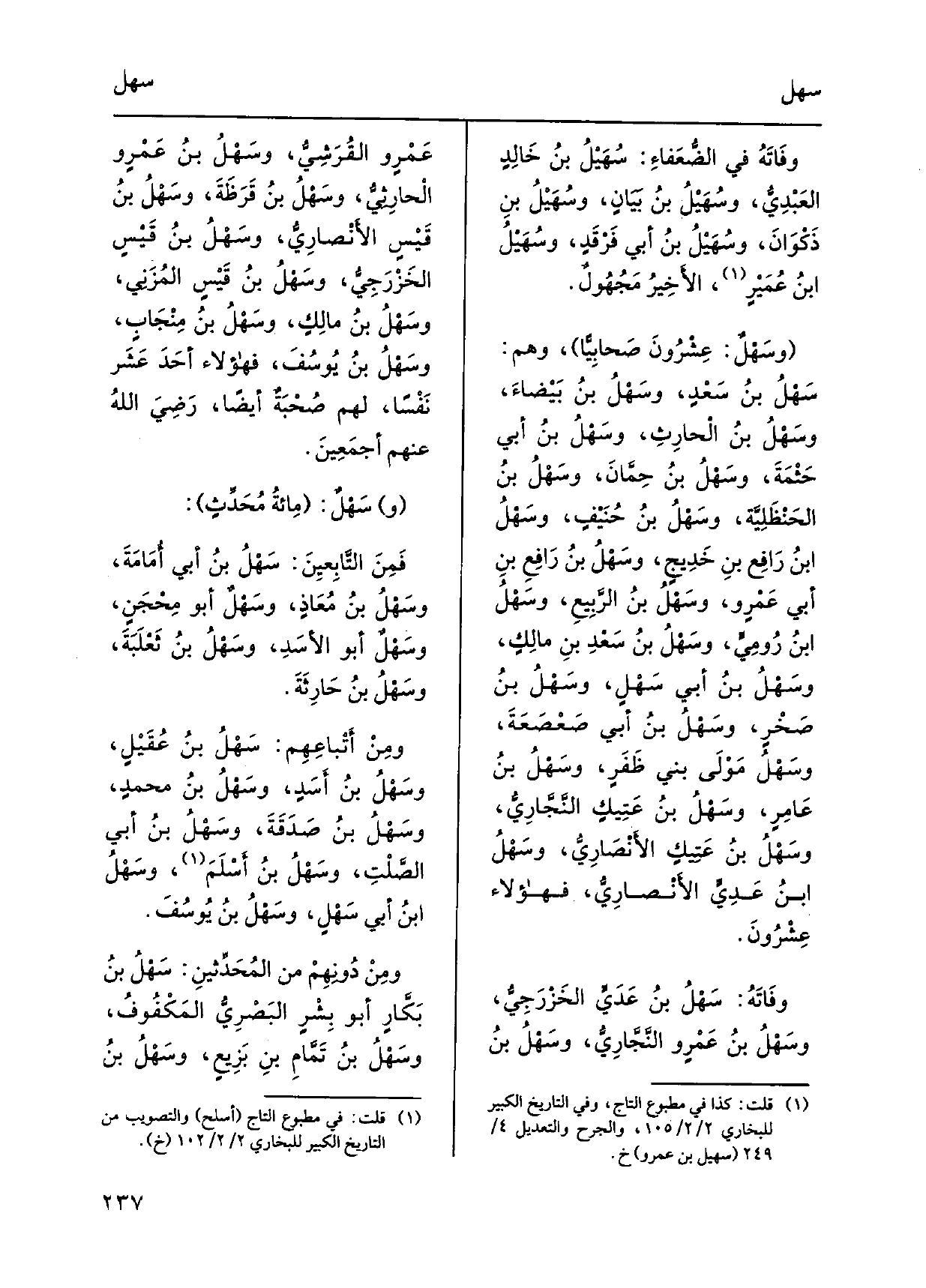 وفَاتَهُ فِي الضُّعَفاءِ: سُهَيْلُ بنُ خَالِدٍ العَبْدِيُّ، وسُهَيْلُ بنُ بَيَانٍ، وسُهَيْلُ بنِ ذَكْوَانَ، وسُهَيْلُ بنُ أبي فَرْقَدٍ، وسُهَيْلُ ابنُ عُمَيْرٍ، الأَخِيرُ مَجُهُولٌ. وسَهْلٌ: عِشْرُونَ صَحابِيّاً، وهم: سَهْلُ بنُ سَعْدٍ، وسَهْلُ بنُ بَيْضاءَ، وسَهْلُ بنُ الْحارِثِ، وسَهْلُ بنُ أبي حَثْمَةَ، وسَهْلُ بنُ حِمَّانَ، وسَهْلُ بنُ الحَنْظَلِيَّة، وسَهْلُ بنُ حُنَيْفٍ، وسَهْلُ ابنُ رَافِع بنِ خَدِيجٍ، وسَهْلُ بنُ رَافِعِ بنِ أَبي عَمْرٍ و، وسَهْلُ بنُ الرَّبِيعِ، وسَهْلُ ابنُ رُومِيٍّ، وسَهْلُ بنُ سَعْدِ بنِ مالِكٍ، وسَهْلُ بنُ أبي سَهْلٍ، وسَهْلُ بنُ) صَخْرٍ، وسَهْلُ بنَُأبي صَعْصَعَةَ، وسَهْلُ مَوْلَى بني ظَفَرٍ، وسَهْلُ بنُ عَامِرٍ، وسَهْلُ بنُ عَتِيكٍ الأَنْصَارِيُّ، وسَهْلُ ابنُ عَدِيٍّ الأَنْصارِيُّ، فَهَؤُلَاءِ عِشْرُونَ. وفَاتَهُ: سَهْلُ بنُ عَدّيٍّ الخَزْرَجِيُّ، وسَهْلُ بنُ عَمْرٍ والنَّجَّارِيُّ، وسَهْلُ بنُ عَمْرٍ والقُرَشِيُّ، وسَهْلُ بنُ عَمْرٍ والْحارِثِيُّ، وسَهْلُ بنُ قَرَظَةَ، وسَهْلُ بنُ قَيْسٍ الأَنْصارِيُّ، وسَهْلُ بنُ قَيْسٍ المُزَنِي، وسَهْلُ بنُ مالكٍ، وسَهْلُ بنُ مَنْجَابٍ، وسَهْلُ بنُ يُوسُفَ، فَهَؤُلَاءِ أَحَدَ عَشَر نَفْساً، لَهُم صُحْبَةٌ أَيْضا، رَضِيَ اللهُ عَنْهُم أَجمَعِينَ.
