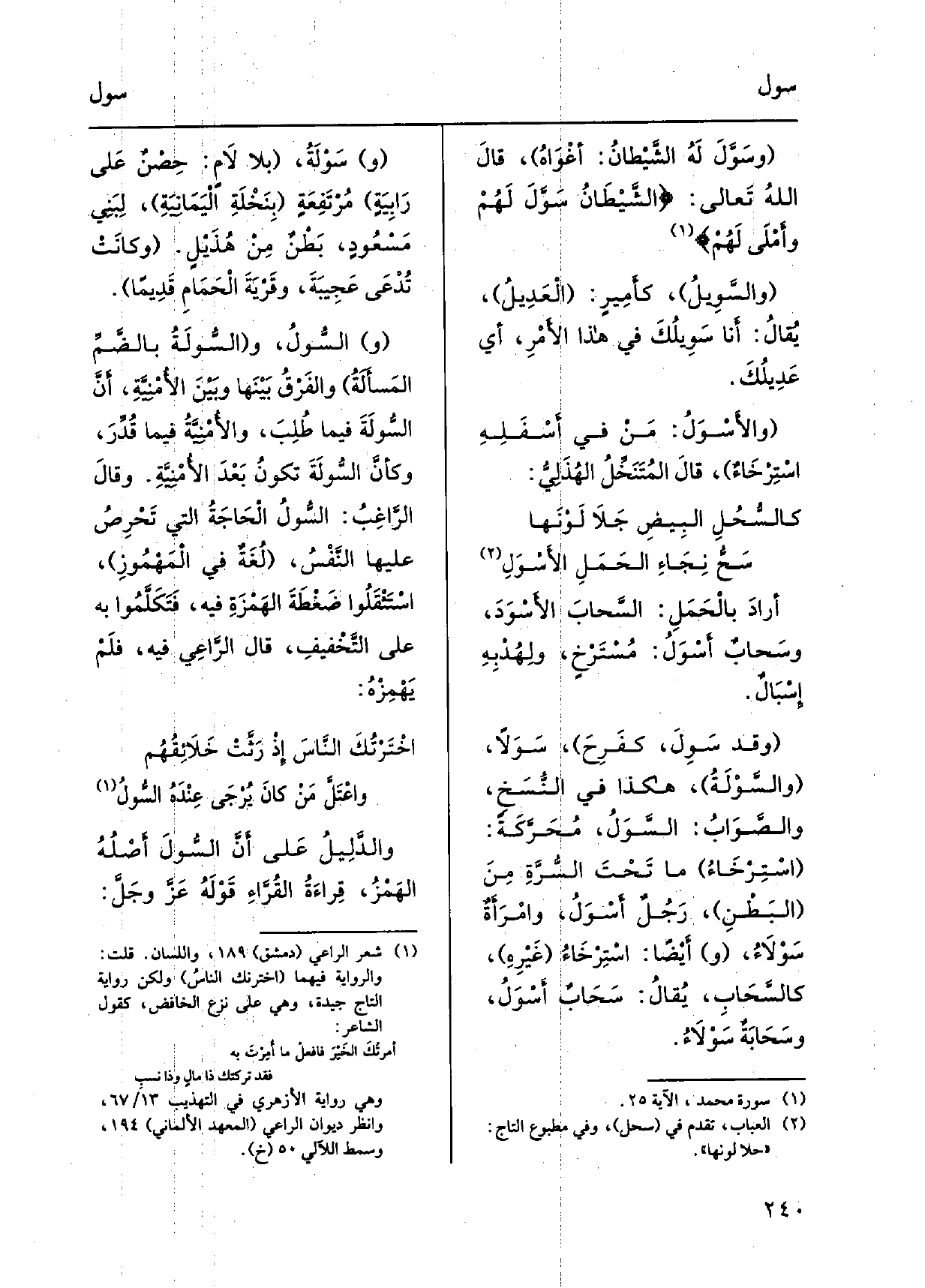 أرادَ بالْحَمَلِ: السَّحَابَ الأَسْوَدَ، وسَحابٌ {أسْوَلُ: مُسْتَرْخٍ، ولِهُدْبِهِ إِسْبَالٌ. وَقد} سَوِلَ، كفَرِحَ، {سَوَلاً،} والسَّوْلَةُ، هَكَذَا فِي النُّسَخِ، والصَّوَابُ: {السَّوَلُ، مُحَرَّكَةً: اسْتِرْخَاءُ مَا تَحْتَ السُّرَّةِ مِنَ البَطْنِ، رَجُلٌ} أسْوَلُ، وامْرَأَةٌ {سَوْلاَءُ، وأيْضاً: اسْتِرْخَاءُ غَيْرِهِ، كالسَّحَابِ، يُقالُ: سَحَابٌ أسْوَلُ، وسَحَابَةٌ} سَوْلاَءُ. (و) {سَوْلَةُ، بِلَا لاَم: حِصْنٌ عَلى راَبِيَةٍ مُرْتَفِعَةٍ بِنَخْلَةِ الْيَمَانِيَةِ، لِبَنِي مَسْعُودٍ، بَطْنٌ مِنْ هُذَيْلٍ. وكانَتْ تُدْعَى عَجِيبَةَ، وقَرْيَةَ الْحَمَامِ قَدِيماً. (و) } السُّولُ، و! السُّولَةُ بالضَّمِّ المَسأَلَةُ والفَرْقُ بَيْنَها وبَيْنَ الأَمْنِيَّةِ، أنَّ السُّولَةَ فِيمَا طُلِبَ، والأُمْنِيَّةِ فِيمَا قُدِّرَ، وكأَنَّ السُّولَةَ تكونُ بَعْدَ الأُمْنِيَّةِ.