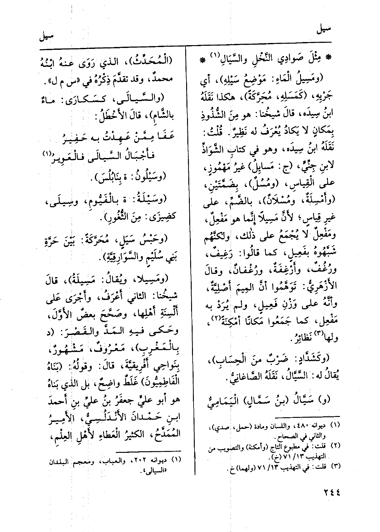 } وسَيْلُونُ: ة بِنَابُلُسَ. {وسَيْلَةُ: ة بالْفَيُّومِ،} وسِيلَى، كضِيزَى: مِنَ الثُّغُورِ. وحَبْسُ {سَيَلٍ، مَحَرَّكَةً: بَيْنَ حَرَّةٍ بَنِي سُلَيْمٍ والسَّوَارِقِيَّةِ.} ومَسِيلا، ويُقالُ:! مَسِيلَةُ، قالَ شَيخُنا: الثَّانِي أَعْرَفُ، وأَجْرَى عَلى أَلْسِنَةِ أهْلِها، وصحَّحَ بعضٌ الأَوَّلَ، وحَكى فيهِ المَدُّ والقَصْرَ: د، بِالْمَغْرِبِ، مَعْرُوفٌ، مَشْهُورٌ، بِنَواحِي أَفْرِيقيَّةَ، قالَ: وقولُهُ: بَنَاهُ الْفَاطِمِيُّونَ غَلَطٌ واضِحٌ، بل الَّذِي بَناهُ هُوَ أَبُو عليٍّ جَعفَرُ بنُ عليِّ بنِ أَحمدَ ابنِ حَمْدَانَ الأَنْدَلُسِيُّ، الأَميرُ المُمَدَّحُ، الكثيرُ الْعَطاءِ لأَهْلِ العِلْمِ،