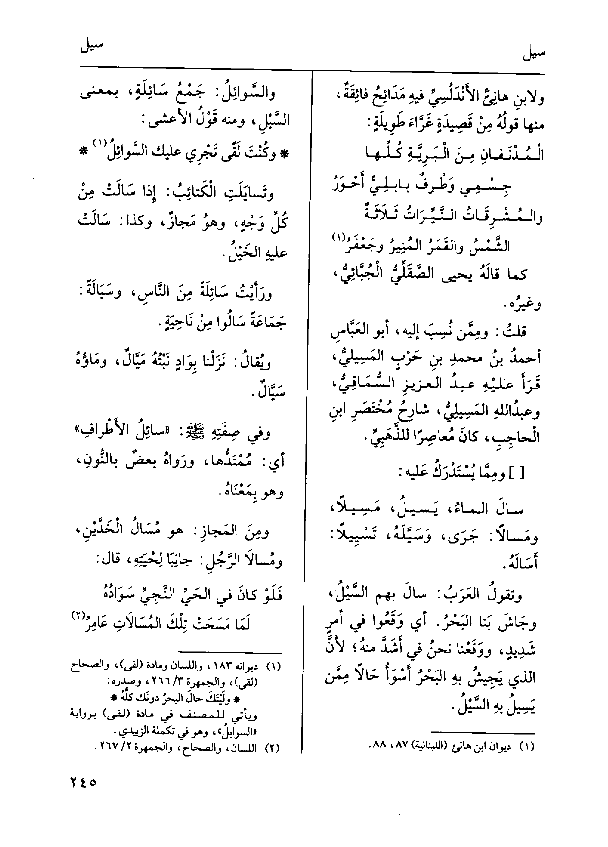 } والسَّوائِلُ: جَمْعُ {سَائِلَةٍ، بِمَعْنى} السَّيْلِ، وَمِنْه قَوْلُ الأَعشى: وكُنْتَ لَقىً تَجْرِي عَلَيْك السَّوائِلُ {وتَسايَلَتِ الْكَتائِبُ: إِذا} سَالَتْ مِنْ كُلِّ وَجْهٍ، وهوُ مَجازٌ، وَكَذَا: سَالَتْ عليهِ الخَيْلُ. ورَأَيْتُ {سَائِلَةً مِنَ النَّاسِ،} وسَيَالَةً: جَمَاعَةً {سَالُوا مِنْ نَاحِيَةٍ. ويُقالُ: نَزَلْنا بِوَادٍ نَبْتُهُ مَيَّالٌ، ومَاؤُهُ} سَيَّالٌ. وَفِي صِفَتِهِ صلى الله عَلَيْهِ وَسلم: {سائِلُ الأَطْرافِ أَي: مُمْتَدُّها، ورُواهُ بعضٌ بالنُّونِ، وَهُوَ بِمَعْنَاهُ.
