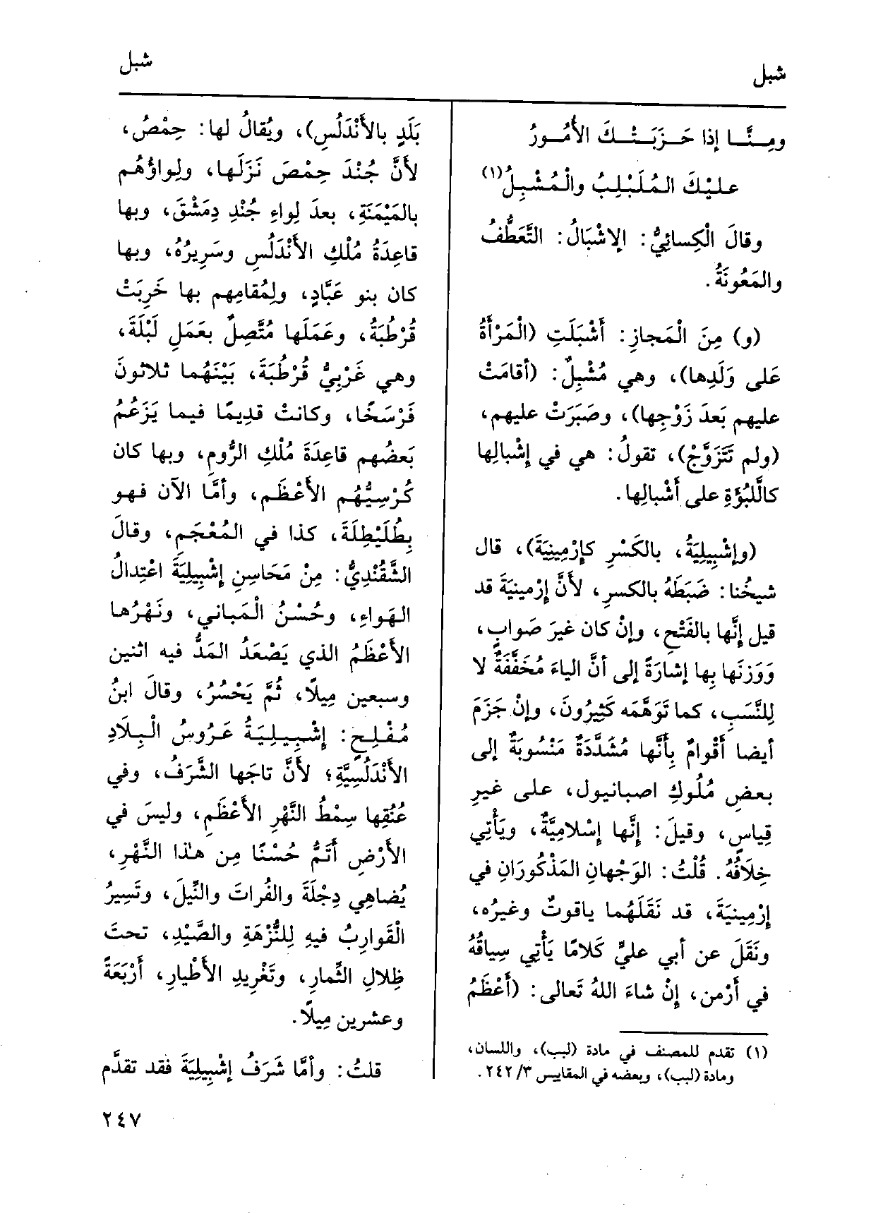 وقالَ الْكِسائِيُّ: الإشْبَالُ: التَّعَطُّفُ والمَعُونَةُ. ومِنَ الْمَجازِ: أَشْبَلَتِ الْمَرْأَةُ عَلى وَلَدِها، وَهِي مُشْبِلٌ: أقامَتْ عَلَيْهِم بَعدَ زَوْجِها، وصَبَرَتْ عَلَيْهِم، وَلم تَتَزَوَّجْ، تقولُ: هِيَ فِي إشْبالِها كالَّلبُؤَةِ على أشْبالِها. وإِشْبِيلِيَةُ، بالكَسْرِ كإِرْمِينِيَةَ، قَالَ شيخُنا: ضَبَطَهُ بالكسرِ، لانَّ إِرْمينيَةَ قد قيل إِنَّها بالفَتْحِ، وإِنْ كَانَ غيرَ صَوابٍ، وَوَزنَها بِها إشارَةً إِلَى أَنَّ الياءَ مُخَفَّفَةٌ لَا لِلنَّسَبِ، كَمَا تَوَهَّمَه كَثِيرُونَ، وإنْ جَزَمَ أَيْضا أَقْوامٌ بِأَنَّها مُشَدَّدَةٌ مَنْسُوبَةٌ إِلَى بعضِ مُلُوكِ اصبانيول، على غيرِ قِياسٍ، وقيلَ: إِنَّها إِسْلامِيَّةٌ، ويَأْتِي خِلاَفُهُ. قُلْتُ: الوَجْهانِ المَذْكُورَانِ فِي إِرْمِينيَةَ، قد نَقَلَهُما)