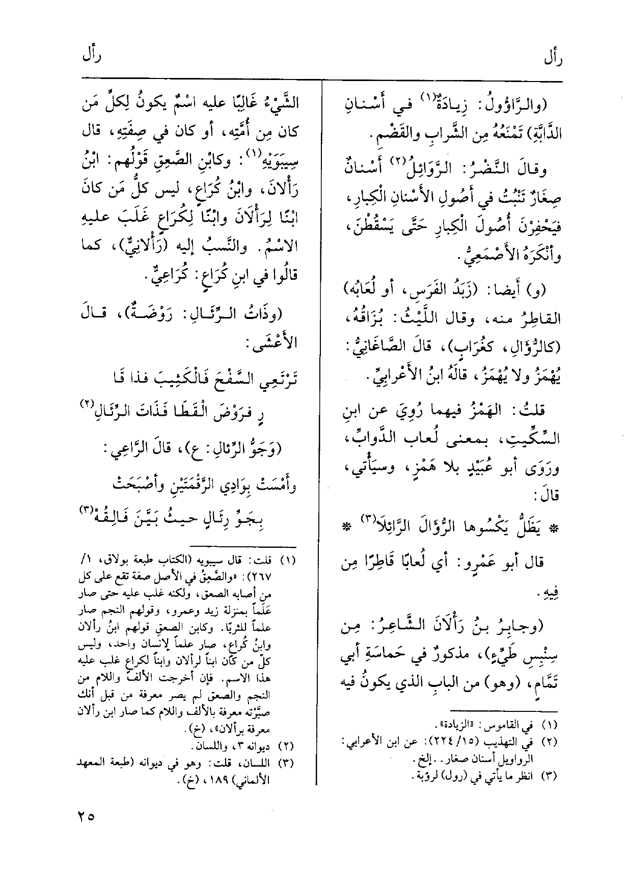 قَالَ أَبُو عَمْرٍ و: أَي لُعاباً قاطِراً من فِيهِ. وجابِرُ بنُ {رَأْلاَنَ الشَّاعِرُ: مِنْ سِنْبِسِ طَيِّءٍ، مذكورٌ فِي حَماسَةِ أبي تَمَّامٍ، وَهُوَ من البابِ الَّذِي يكونُ فِيهِ الشَّيْءُ غَالِباً عَلَيْهِ اسْمٌ يكونُ لِكلِّ مَنْ كَانَ من أُمَّتِه، أَو كَانَ فِي صِفَتِهِ، قَالَ سِيبَوَيْهِ: وكابْنِ الصَّعِقِ قَوْلُهُم: ابْنُ رَأْلانَ، وابْنُ كُرَاعٍ، لَيْسَ كلُّ مَن كانَ ابْناً} لِرَأْلاَنَ وابْناً لِكُرَاعٍ غَلَبَ عليهِ الاسْمُ. والنَّسَبُ إِلَيْهِ {- رَأْلانِيٌّ، كَمَا قالُوا فِي ابنِ كُرَاعٍ: كُرَاعِيٌّ. وذَاتُ} الرِّئَالِ: رَوْضَةٌ، قالَ الأَعْشَى: