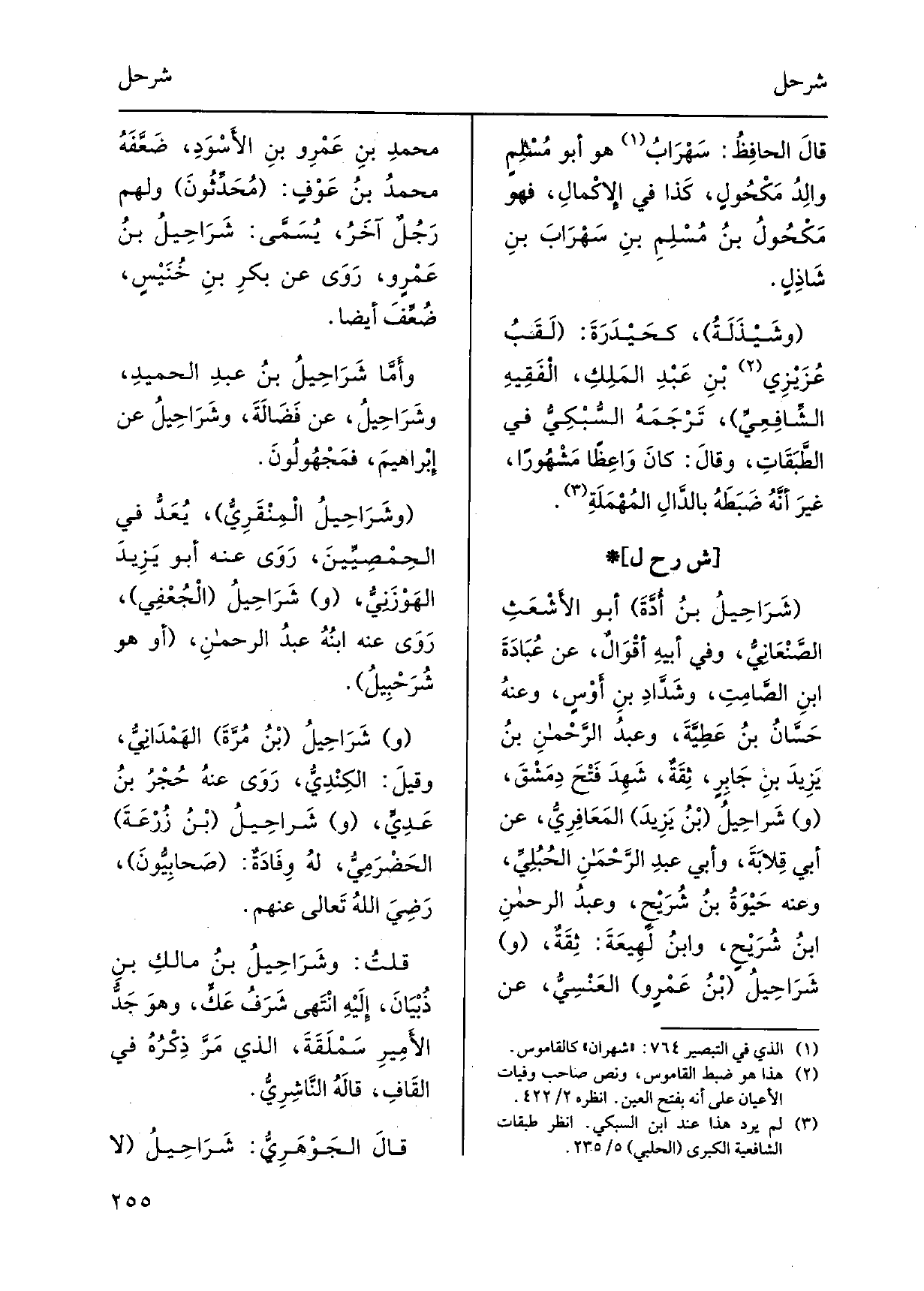 شَرَاحِيلُ بنُ أَدَّةَ أَبُو الأَشْعَثِ الصَّنْعَانِيُّ، وَفِي أبيهِ أَقْوَالٌ، عَن عُبَادَةَ ابنِ الصَّامِتِ، وشَدَّادِ بنِ أَوْسِ، وعنهُ حَسَّانَ بنُ عَطِيَّةَ، وعبدُ الرَّحْمَنِ بنُ يَزِيدَ بنِ جَابِرٍ، ثِقَةٌ، شَهِدَ فَتْحَ دِمَشْقَ، وشَراحِيلُ بْنُ يَزِيدَ المَعَافِرِيُّ، عَن أبي قِلاَبَةَ، وَأبي عبدِ الرَّحْمَنِ الحُبُلِيِّ، وَعنهُ حَيْوَةُ بنُ شُرَيْحٍ، وعبدُ الرحمنِ ابنُ شُرَيْحٍ، وابنُ لَهِيعَةَ: ثِقَةُ، وشَرَاحِيلُ بْنُ عَمْرٍ والعَنْسِيُّ، عَن محمدِ عَمْرٍ وبنِ الأَسُوَدِ، ضَعَّفَهُ محمدُ بنُ عَوْفٍ: مَحَدِّثُونَ وَلَهُم رَجُلٌ آخَرُ، يُسَمَّى: شَرَاحِيلُ بنُ عَمْرٍ، رَوَى عَن بكرِ بنِ خُنَيْسٍ، ضُعِّفَ أَيْضا.