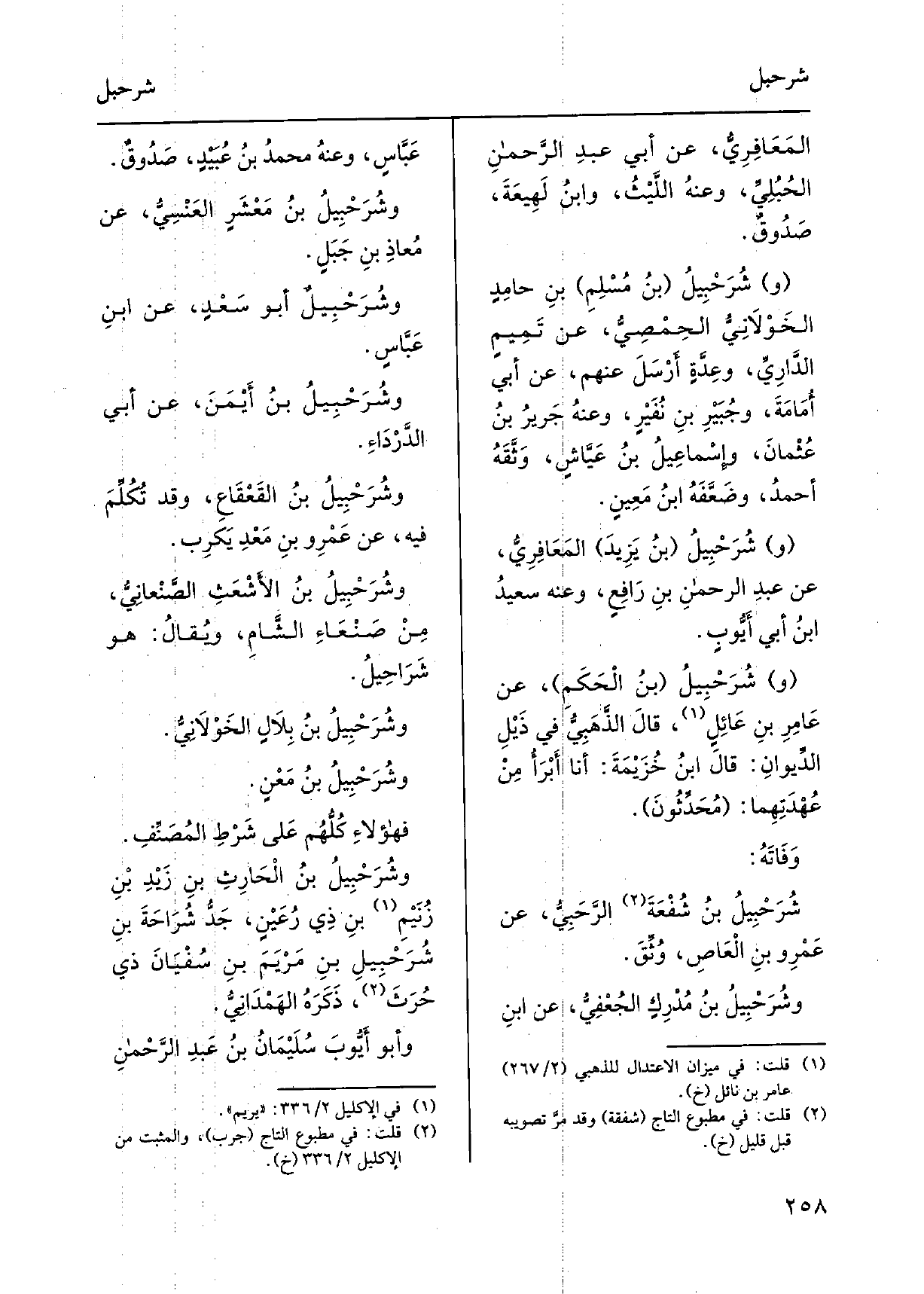 الخَوْلاَنِيُّ الحِمْصِيُّ، عَن تَمِيمٍ الدَّارِيِّ، وعِدَّةٍ أَرْسَلَ عَنْهُم، عَن أبي أَمَامَةَ، وجَبَيْرِ بنِ نُفَيْرٍ، وعنهُ جَريرُ بنُ عُثَمانَ، وإسْماعِيلُ بنُ عَيَّاشٍ، وَثَّقَهُ أحمدُ، وضَعَّفَهُ ابنُ مَعِينٍ. وشُرَحْبِيلُ بنُ يَزِيدَ المَعَافِرِيُّ، عَن عبدِ الرحمنِ بنِ رَافِعٍ، وَعنهُ سعيدُ ابنُ أبي أيُّوبٍ. وشُرَحْبِيلُ بنُ الْحَكَمِ، عَن عَامِرِ بنِ عَائِلٍ، قالَ الذَّهَبِيُّ فِي ذَيْلِ الدِّيوانِ: قالَ ابنُ خُزَيْمَةَ: أَنا أَبْرَأُ مِنْ عُهْدَتِهِما: مَحَدِّثُونَ. وفَاتَهُ: شُرَحْبِيلُ بنُ شُفْعَةَ الرَّحَبِيُّ، عَن عَمْرِو بنِ الْعَاصِ، وُثِّقَ. وشُرَحْبِيلُ بنُ مُدْرِكٍ الجُعْفِيُّ، عَن ابنِ عَبَّاسٍ، وعنهُ محمدُ بنُ عُبَيْدٍ، صَدُوقٌ. وشُرَحْبِيلُ بنُ مَعْشَرٍ العَنْسِيُّ، عَن مَعاذِ بنِ جَبَلٍ. وشُرَحْبِيلٌ أَبُو سَعْدٍ، عَن ابنِ عَبَّاسٍ. وشُرَحْبِيلُ بنُ أَيْمَنَ، عَن أبي الدَّرْدَاءِ.