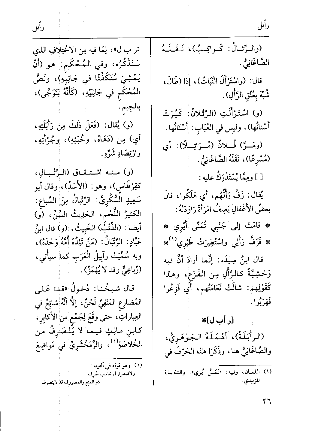 {الرأْبَلَةُ، أهْمَلَهُ الجَوْهَرِيُّ، والصّاغَانِيُّ هُنَا، وذَكَرا هَذَا الحَرْفَ فِي ر ب ل، لِمَا فِيهِ من الاخْتِلافِ الَّذِي سَنَذْكُرُه، وَفِي المُحْكَمِ: هُوَ أَنْ يَمْشِيَ مُتَكَفِّئاً فِي جَانِبِهِ، ونَصُّ المُحْكَمِ فِي جَانِبَيهِ، كَأَنَّهُ يَتَوجَّى، بالجِيمِ. ويُقال: فَعَلَ ذلكَ مِن} رَأْبَلَتِهِ، أَي مِن دَهَاهُ، وخُبْثِهِ، وجُرْأَتِهِ، وارتِصَادِ شَرِّهِ. وَمِنْه اشتقاق {الرِّئْبالِ، كقِرْطَاسٍ، وَهُوَ: الأَسَدُ، وَقَالَ أَبُو سَعِيدٍ السُّكَّرِيُّ: الرِّئْبَالُ مِنَ السِّباعِ: الكثيرُ اللَّحْم، الحَدِيثُ السِّنِّ، وَأَيْضًا: الذِّئْبُ الخَبِيثُ، وَقَالَ ابنُ عَبَّادٍ: الرِّئْبَالُ: مَنْ تَلِدُهُ أُمُّهُ وَحْدَهُ، وَبِه سُمِّيَتْ} رآبِيلُ الْعَرَبِ كَمَا سَيَأْتِي، رُباعِيٌّ وَقد لَا يُهْمَزُ. قَالَ شيخُنا: دُخولُ قد على المُضارِعِ المَنْفِيِّ لَحْنٌ، إلاَّ أنَّهُ شائِعٌ فِي العِباراتِ، حَتَّى وقَعَ لِجَمْع من الأكابِرِ، كابنِ مالِكٍ فِيمَا لَا يَنْصَرِفُ من الخُلاصَةِ، والزَّمَخْشَرِيِّ فِي مَواضِعَ