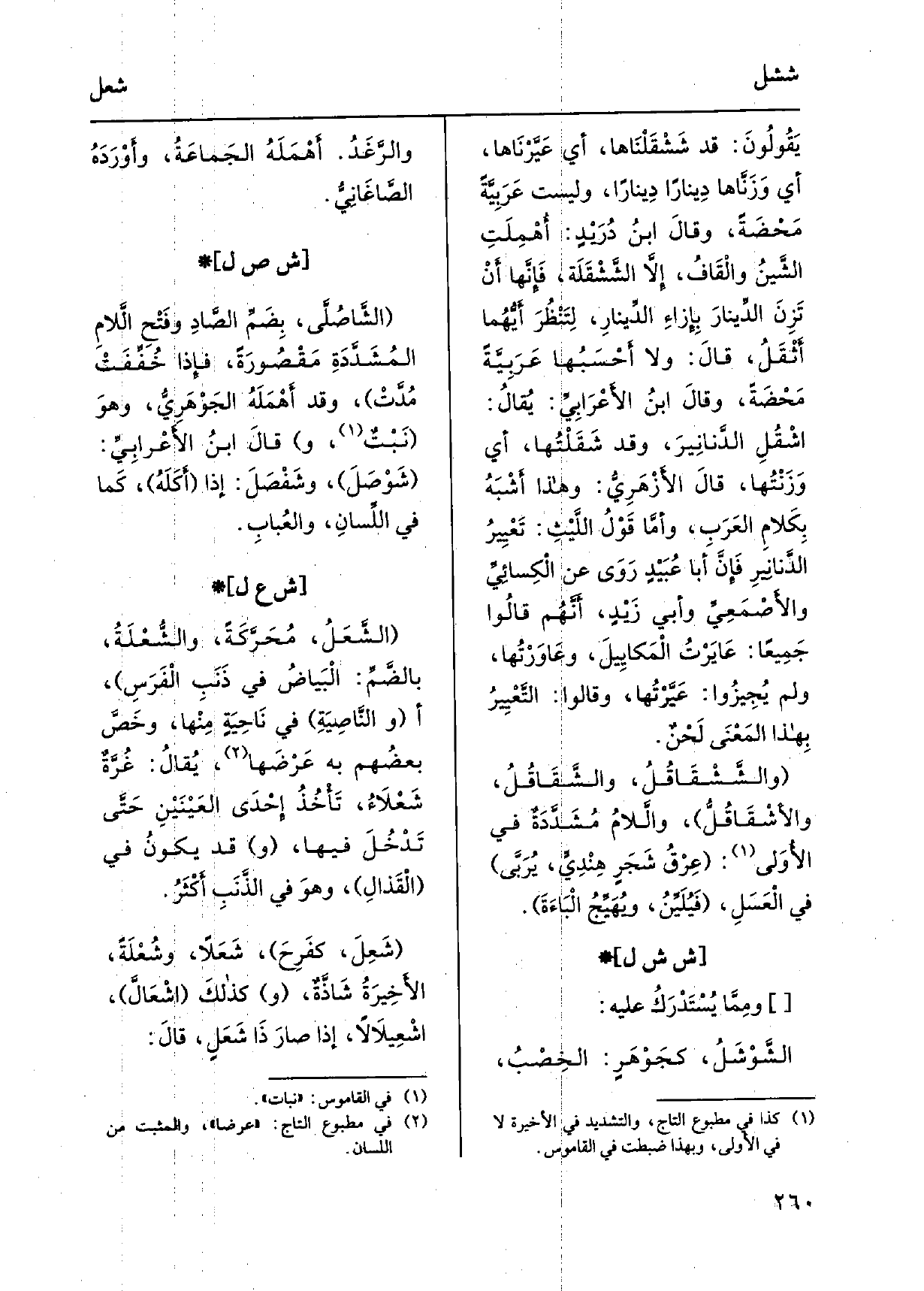 يَقُولُونَ: قد شَشْقَلْنَاها، أَي عَيَّرْنَاها، أَي وَزَنَّاها دِيناراً دِيناراً، وَلَيْسَت عَرَبِيَّةً مَحْضَةً، وقالَ ابنُ دُرَيْدٍ: أَهْمِلَتِ الشِّينُ والقافُ، إلاَّ الشَّشْقَلَة، فَإِنَّها أَنْ تَزِنَ الدِّينارَ بِإِزاءِ الدِّينارِ، لِتَنْظُرَ أَيُّهُما أَثْقَلُ، قالَ: وَلَا أَحْسَبُها عَرَبِيَّةً مَحْضَةً، وقالَ ابنُ الأَعْرَابِيِّ: يُقالُ: أشْقُلِ الدَّنانِيرَ، وَقد شَقَلْتُها، أَي وَزَنْتُها، قالَ الأَزْهَرِيُّ: وَهَذَا أشْبَهُ بِكَلامِ العَرَبِ، وأَمَّا قَوْلُ اللَّيْثِ: تَعْيِيرُ الدَّنانِيرِ فَإِنَّ أَبَا عُبَيْدٍ رَوَى عَن الْكِسائِيِّ والأَصْمَعِيِّ وَأبي زَيْدٍ، أَنَّهُم قالُوا جَمِيعاً: عَايَرْتُ الْمَكايِيلَ، وعَاوَرْتُها، وَلم يُجِيزُوا: عَيَّرْتُها، وَقَالُوا: التَّعْيِيرُ بِهذا المَعْنَى لَحْنٌ. والشَّشْقَاقُلُ، والشَّقَاقُلُ، والأشْقَاقُلُ، والَّلامُ مُشَدَّدَةٌ فِي الأُوَلى: عِرْقُ شَجَرٍ هِنْدِيٍّ، يُرَبَّى فِي الْعَسَلِ، فَيُلَيِّنُ، ويُهَيِّجُ الْبَاءَةَ.