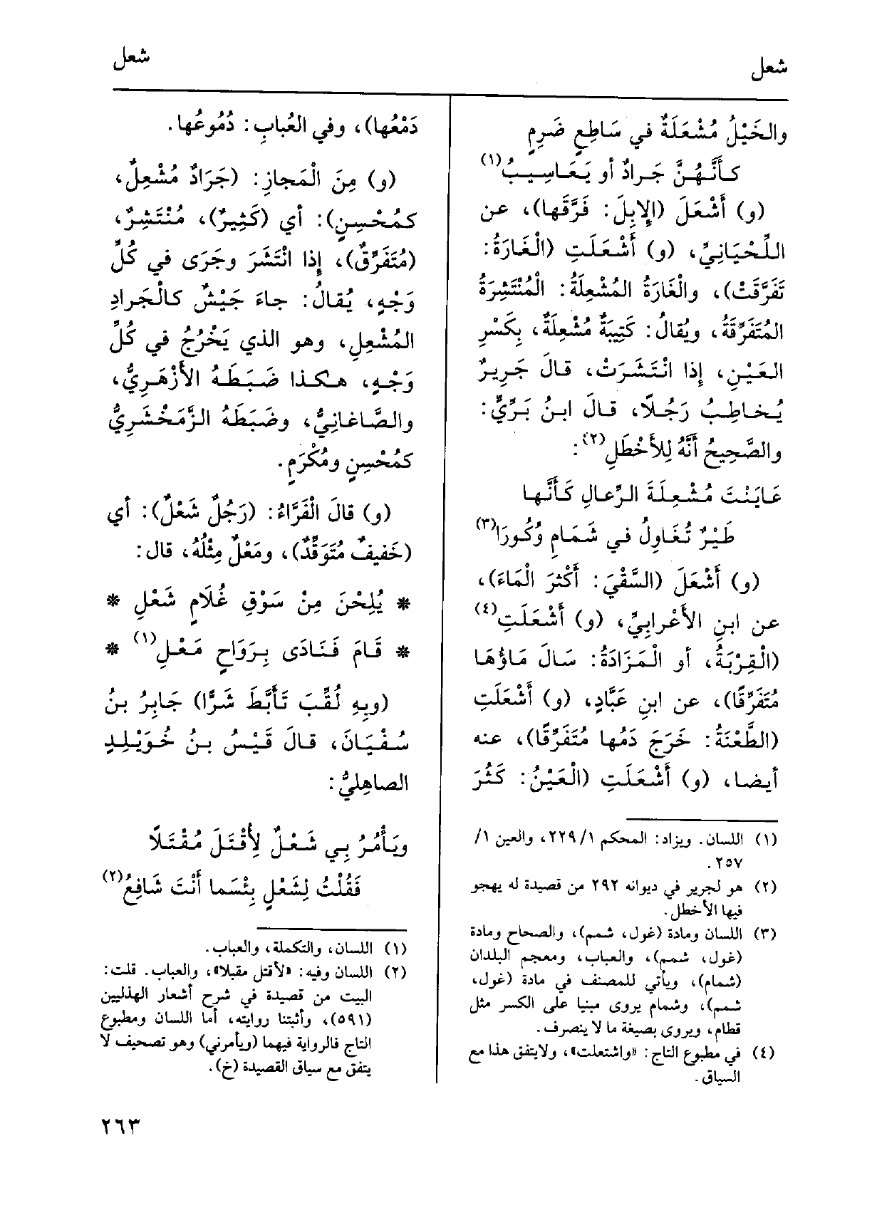 ومِنَ الْمَجازِ: جَرَادٌ مُشْعِلٌ، كمُحْسِنٍ: أَي كَثِيرٌ، مُنْتَشِرٌ، مَتَفَرِّقٌ، إِذا انْتَشَرَ وجَرَى فِي كُلِّ وَجْهٍ، يُقالُ: جاءَ جَيْشٌ كالْجَرادِ المُشْعِلِ، وَهُوَ الَّذِي ضَبَطَهُ الأَزْهَرِيُّ، والصَّاغَانِيُّ، وضَبَطَهُ الزَّمَخْشَرِيُّ كمُحْسِنٍ ومُكْرَمٍ. وقالَ الْفَرَّاء: رَجُلٌ شَعْلٌ: أَي خَفِيفٌ مُتَوَقِّدٌ، ومَعْلٌ مِثْلُهُ، قَالَ: يُلِحْنَ مِنَ سَوْقِ غُلاَمٍ شَعْلِ قَامَ فَنَادَى بِرَوَاحٍ مَعْلِ وبِهِ لُقِّبَ تَأَبَّطَ شَرًّا جَابِرُ بنُ سُفْيَانَ، قالَ قَيْسُ بنُ خُوَيْلِدٍ الصاهِليُّ: