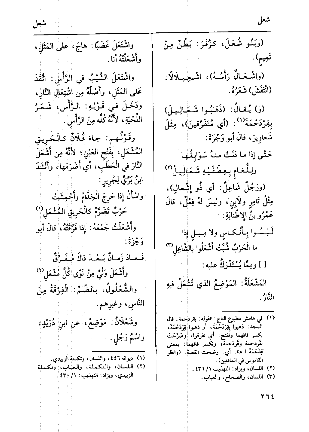 ومِمَّا يُسْتَدْرَكُ عَليه: المَشْعَلَةُ: المَوْضِعُ الَّذِي تُشْعَلُ فيهِ النَّارُ. واشْتَعَلَ غَضَباً: هاجَ، على المَثَلِ، وأشْعَلْتُهُ أَنا. واشْتَعَلَ الشَّيْبُ فِي الرَّأْسِ: اتَّقَدَ عَلى المَثَلِ، وأصْلُهُ مِن اشْتِعَالِ النَّارِ، ودَخَلَ فِي قَوْلِهِ: الرَّأْس، شَعَرُ اللِّحْيَةِ، لأَنَّهُ كُلَّهُ مِنَ الرَّأْسِ. وقَوْلُهم: جاءَ فُلاَنٌ كالْحَرِيقِ المُشْعَلِ، بِفَتْحِ العَيْنِ، لأنَّهُ مِن أشْعَلَ النَّارَ فِي الْحَطَبِ، أَي أَضْرَمَها، وأَنْشَدَ ابنُ بَرِّيٍّ لِجَرِيرٍ: