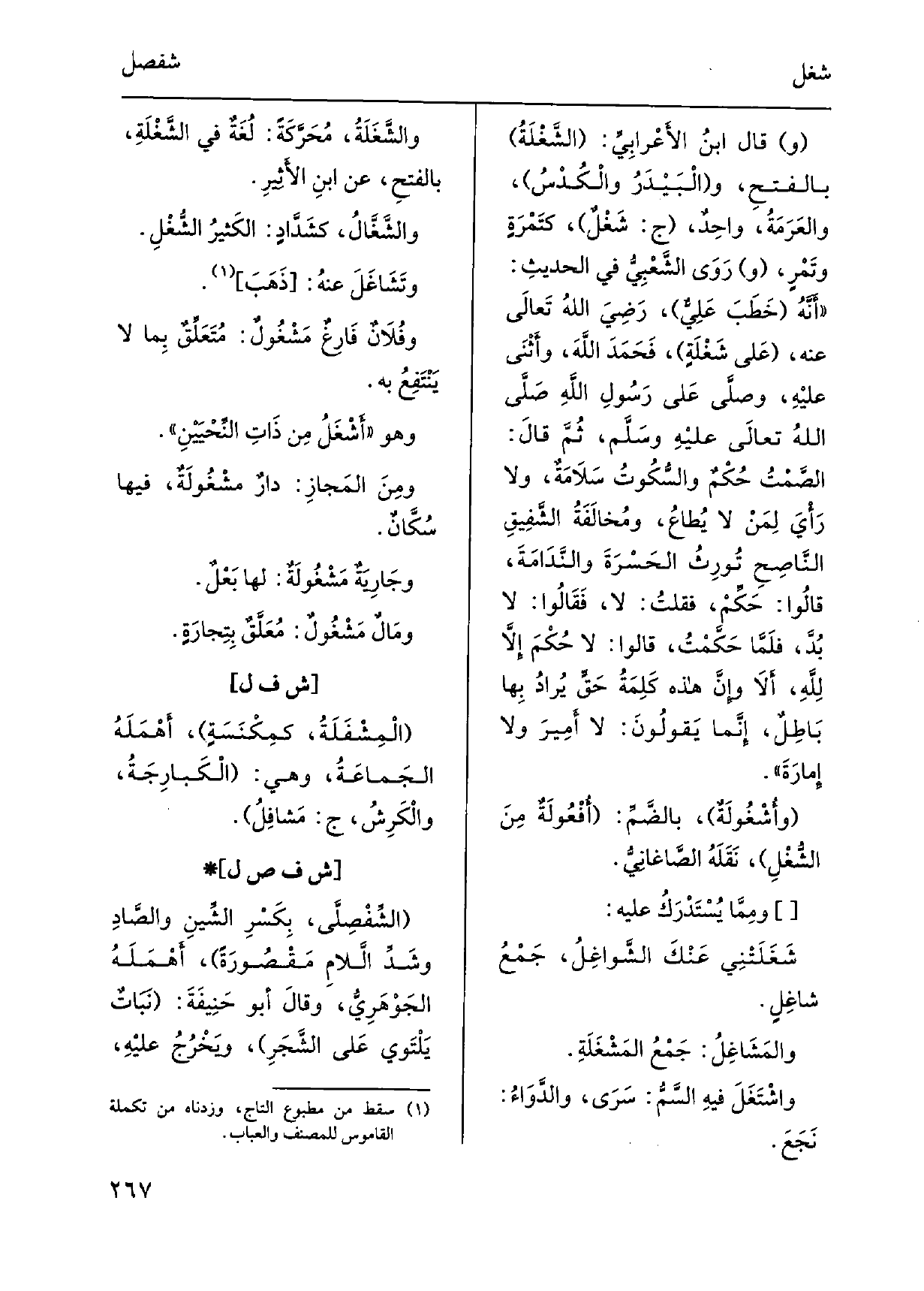 وَقَالَ ابنُ الأَعْرابِيِّ: الشَّغْلَةُ: بالفتحِ، والْبَيْدَرُ والْكُدْسُ، والعَرَمَةُ، واحِدٌ، ج: شَغْلٌ، كتَمْرَةٍ وتَمْرٍ، ورَوَى الشَّعْبِيُّ فِي الحديثِ: أَنَّهُ خَطَبَ عَلِيٌّ، رَضِيَ اللهُ تَعالَى عَنهُ عَلى شَغْلَةٍ، فَحَمَدَ اللهَ، وأثْنَى عليْهِ، وصَلَّى عَلى رَسُولِ اللهِ صلَّى اللهُ تَعالى عليْهِ وسلَّم، ثُمَّ قالَ: الصَّمْتُ حُكْمٌ والسُّكُوتُ سَلاَمَةٌ، وَلَا رَأْيَ لِمَنْ لَا يُطاعُ، ومُخالَفَةُ الشَّفِيقِ النَّاصِحِ تُورِثُ الحَسْرَةَ والنَّدَامَةَ، قالُوا: حَكِّمْ، فقلتُ: لَا، فَقَالُوا: لَا بُدَّ، فَلَمَّا حَكَّمْتُ، قَالُوا: لَا حُكْمَ إلاَّ لِلِّهِ، ألاَ وإِنَّ هَذِه كَلِمَةُ حَقٍّ يُرادُ بِها بَاطِلٌ، إِنَّما يَقولُونَ: لَا أمِيرَ وَلَا إِمارَةَ. وأشْغُولَةٌ، بالضَّمِّ: أفْعُولَةٌ مِنَ الشُّغْلِ، نَقَلَهُ الصَّاغَانِيُّ. ومِمَّا يُسْتَدْرَكُ عَليه: شَغَلَتْنِي عَنْكَ الشَّواغِلُ، جَمْعُ شاغِلٍ. والمَشَاغِلُ: جَمْعُ المَشْغَلَةِ. واشْتَغَلَ فيهِ السَّمُّ: سَرَى، والدَّوَاءُ: نَجَعْ. والشَّغَلَةُ، مُحَرَّكَةً: لَغُةٌ فِي الشَّغْلَةِ، بالفتحِ، عَن ابنِ الأَثِيرِ. والشَّغَّالُ، كشَدَّادٍ: الكَثيرُ الشُّغْلِ. وتَشَاغَلَ عنهُ: ذَهَبَ.