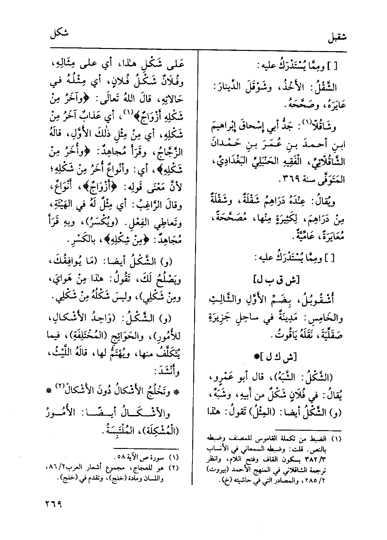 الشَّكْلُ: الشَّبَهُ، قَالَ أَبُو عَمْرٍ و، يُقالُ: فِي فُلاَنٍ شَكْلٌ من أَبيهِ، وشَبَهٌ، والشَّكْلُ أَيْضا: المِثْلُ تَقولُ: هَذَا عَلى شَكْلِ هَذَا، أَي على مِثَالِهِ، وفُلاَنٌ شَكْلُ فُلانٍ، أَي مِثْلُهُ فِي حَالاتِهِ، قالَ اللهُ تَعالَى: وآخَرُ مِنْ شَكْلِهِ أزْوَاجٌ، أَي عَذابٌ آخَرُ مِنْ شَكْلِهِ، أَي مِنْ مِثْلِ ذَلِك الأَوَّلِ، قالَهُ الزَّجَّاجُ، وقَرَأَ مُجاهِدٌ: وأُخَرُ مِنْ شَكْلِهِ، أَي: وأَنْواعٌ أُخَرُ مِنْ شَكْلِهِ لأنَّ مَعْنَى قَولِه: أزْوَاجٌ، أنْوَاعٌ، وقالَ الرَّاغِبُ: أَي مِثْلٌ لَهُ فِي الهَيْئَةِ، وتَعاطِي الفِعْلِ. ويُكْسَرُ، وبهِ قَرَأَ مَجَاهِدٌ: مِنْ شِكْلِهِ، بالكَسْرِ. والشَّكْلُ أَيْضا: مَا يُوافِقُكَ، ويَصْلُحُ لَكَ، تَقُولُ: هَذَا مِنْ هَوايَ، ومِنْ شَكْلِي، وليسَ شَكْلُهُ مِنْ شَكْلِي. والشَّكْلُ: وَاحِدُ الأشْكالِ، للأُمُورِ، والحَوَائِجِ المُخْتَلِفَةِ، فِيمَا يُتَكَلَّفُ مِنْهَا، ويُهْتَمُّ لَهَا، قالَهُ اللَّيْثُ، وأنْشَدَ: وتَخْلَجُ الأشْكالُ دُونَ الأشْكالْ والأشْكَالُ أَيْضا: الأُمُورُ الْمُشْكِلَةِ، المُلْتَبِسَةُ.