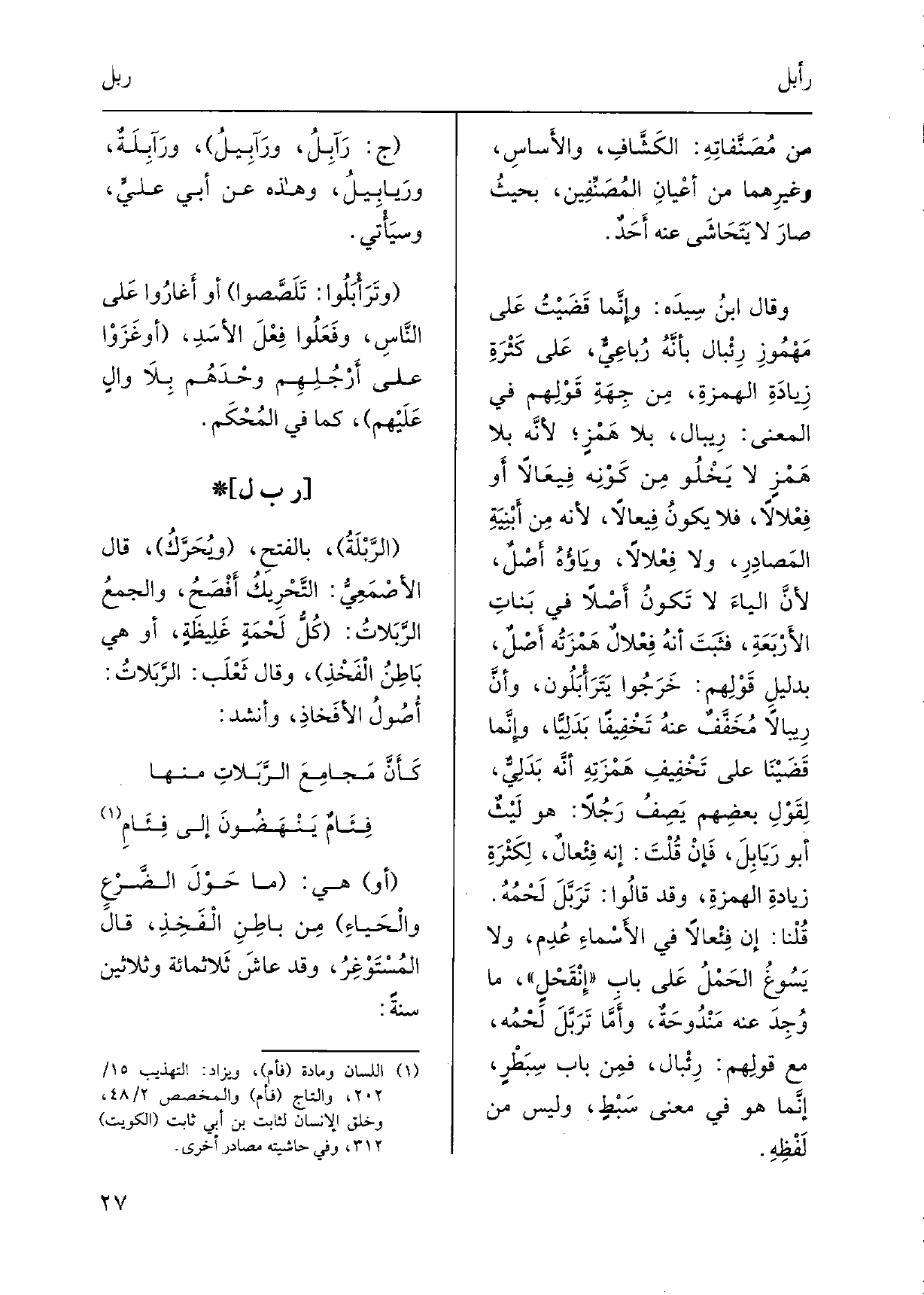 من مُصَنَّفاتِهِ: الكَشَّافِ، والأَساسِ، وغيرِهما من أعْيانِ المُصَنِّفِين، بحيثُ صارَ لَا يَتَحَاشَى عَنهُ أَحَدٌ. وَقَالَ ابنُ سِيدَه: وإِنَّما قَضَيْتُ عَلى مَهْمُوزِ رِئْبال بأنَّهُ رُباعِيٌّ، عَلى كَثْرَةِ زِيادَةِ الهمزةِ، مِن جِهَةِ قَوْلِهِم فِي الْمَعْنى: رِيبال، بِلَا هَمْزٍ، لأنَّهُ بِلَا هَمْزٍ لَا يَخْلُو مِن كَوْنِه فِيعَالاً أَو فِعْلالاً، فَلَا يكونُ فِيعالاً، لِأَنَّهُ مِن أَبْنِيَةِ المَصادِرِ، وَلَا فِعْلالاً، ويَاؤُهُ أَصْلٌ، لأنَّ الياءَ لَا تَكُونُ أَصْلاً فِي بَناتِ الأَرْبَعَةِ، فثَبَتَ أنهُ فِعْلالٌ هَمْزَتُه أَصْلٌ، بدليلِ قَوْلِهم: خَرَجُوا {يَتَرَأْبَلُون، وأنَّ رِيبالاً مُخَفَّفٌ عنهُ تَخْفِيفاً بَدَلِياًّ، وإِنَّما قَضَيْنَا على تَخْفِيفِ هَزْزَتِهِ أنَّه بَدَلِيٌّ، لِقَوْلِ بعضِهم يَصِفُ رَجُلاً: هُوَ لَيْثٌ أَبُو} رَيَابِلَ، فَإنْ قُلْتَ: إِنَّه فِئْعالٌ، لِكُْرَةِ زيادةِ الهمزةِ، وَقد قالُوا: تَرَبَّلَ لَحْمُهُ. قُلْنا: إِن فِئعالاً فِي الأَسْماءِ عُدِم، وَلَا يَسُوغُ الحَمْلُ على بابِ إِنْقَحْلٍ، مَا وُجِدَ عَنهُ مَنْدُوحَةٌ، وأَمَّا تَرَبَّلَ لَحْمُه، مَعَ قولِهم: رِئْبال، فَمن بَاب سِبَطْرٍ، إنَّما هُوَ فِي معنى سَبْطٍ، وَلَيْسَ من لَفْظِهِ. ج: {رَآبِلُ،} ورَآبِيلُ، {ورَآبِلَةٌ،} ورَيابِيلُ، وَهَذِه عَن أبي عليٍّ، وسيَأْتِي.! وتَرَأْبَلُوا: تَلَصَّصوا أَو أَغارُوا عَلى النَّاسِ، وفَعَلُوا فِعْلَ الأَسَدِ، أَو غَزَوْا على أَرْجُلِهِم وحْدَهُم بِلا والٍ عَلَيْهم، كَمَا فِي المُحْكَمْ.