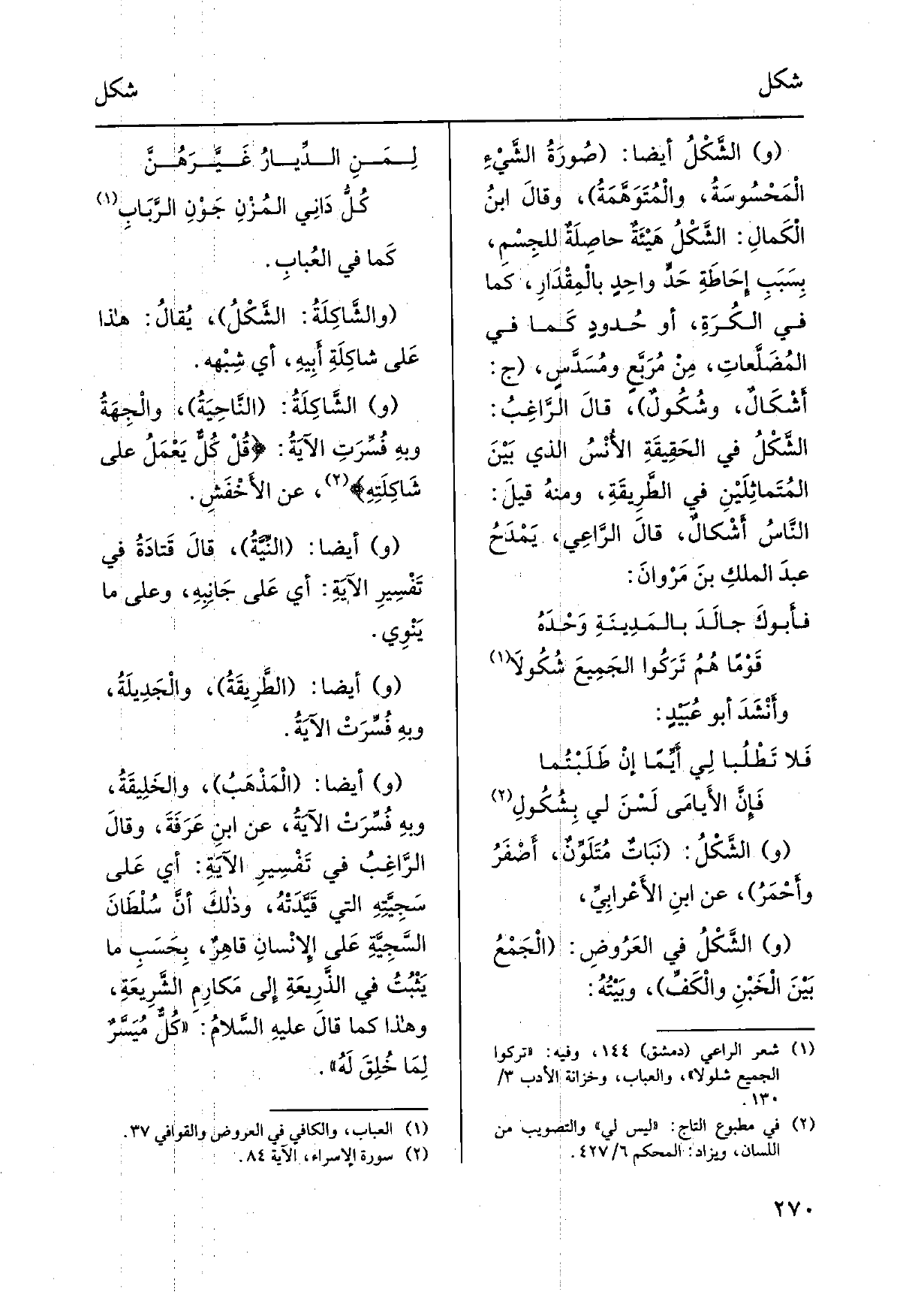 والشَّكْلُ أَيْضا: صُورَةُ الشَّيْءِ الْمَحْسُوسَةُ، والْمُتَوَهَّمَةُ، وقالَ ابنُ الْكَمالِ: الشَّكْلُ هَيْئَةٌ حاصِلَةٌ للجِسْمِ، بِسَبَبِ إِحَاطَةِ حَدٍّ واحِدٍ بالْمِقْدَارِ، كمَا فِي الكُرَةِ، أَو حُدودٍ كَما فِي المُضَلَّعاتِ، مِنْ مُرَبَّعٍ ومُسَدَّسٍ، ج: أشْكَالٌ، وشُكُولٌ، قالَ الرَّاغِبُ: الشَّكْلُ: فِي الحَقِيقَةِ الأَنْسُ الَّذِي بَيْنَ المُتَماثِلَيْنِ فِي الطَّرِيقَةِ، ومنهُ قيلَ: النَّاسُ أشْكالٌ، قالَ الرَّاعِي، يَمْدَحُ عبدَ الملكِ بنَ مَرْوانَ:
