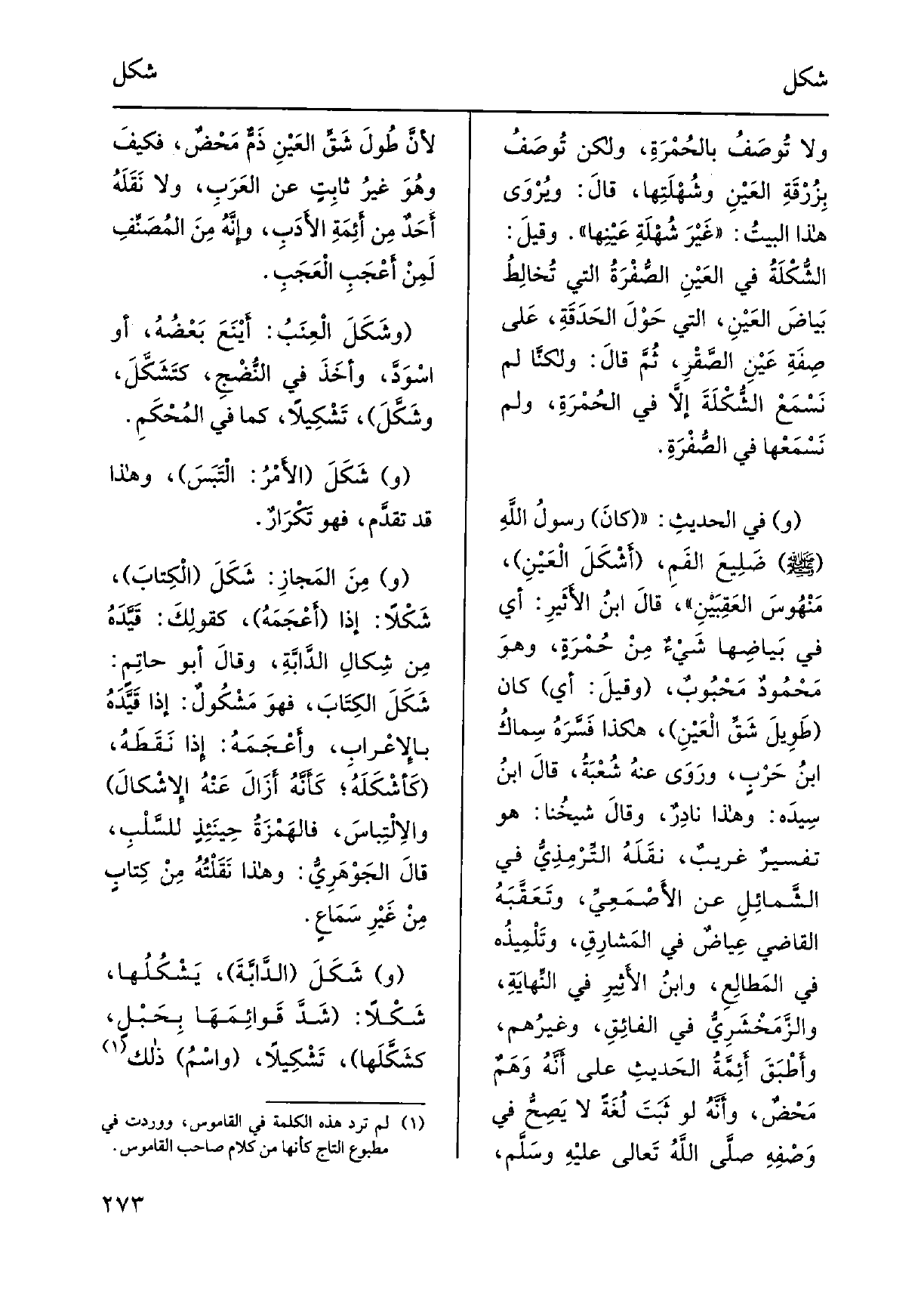 وَلَا تُوصَفُ بالحُمْرَةِ، وَلَكِن تُوصَفُ بِزَرْقَةِ العَيْنِ وشُهْلَتِها، قالَ: ويُرْوَى هَذَا البيتُ: غَيْرَ شُهْلَةِ عَيْنِها. وقيلَ: الشَّكْلَةُ فِي العَيْنِ الصَّفْرَةُ الَّتِي تُخالِطُ بَياضَ العَيْنِ، الَّتِي حَوْلَ الحَدَقَةِ، عَلى صِفَةِ عَيْنِ الصَّقْرِ، ثُمَّ قالَ: ولكنَّا لم نَسْمَعْ الشُّكْلَةَ إلاَّ فِي الحُمْرَةِ، وَلم نَسْمَعْها فِي الصُّفْرَةِ. وَفِي الحديثِ: كانَ رسولُ اللَّهِ صلى الله عَلَيْهِ وَسلم ضَلِيعَ الفَمِ، أشْكَلَ الْعَيْنِ، مَنْهُوسَ العَقِبَيْنِ، قالَ ابنُ الأثَيرِ: أَي فِي بَياضِها شَيْءٌ مِن حَمْرَةٍ، وهوَ مَحْمُودٌ مَحْبُوبٌ، وقيلَ: أَي كَانَ طَوِيلَ شَقِّ الْعَيْنِ، هَكَذَا فَسَّرَهُ سِماكُ ابنُ حَرْبٍ، ورَوَى عنهُ شُعْبُةُ، قالَ ابنُ سِيدَه: وَهَذَا نادِرٌ، وقالَ شَيخُنا: هُوَ تفسيرٌ غريبٌ، نَقَلَهُ التُّرْمِذِيُّ فِي الشَّمائِلِ عَن الأصْمَعِيِّ، وتَعَقَّبَهُ القَاضِي عِياضٌ فِي الْمَشارِقِ، وتَلْمِيذُه فِي المَطالِع، وابنُ الأَثِيرِ فِي النِّهايَةِ، والزَّمَخْشَرِيُّ فِي الفائِقِ، وغيرُهم، وأطْبَقَ أَئِمَّةُ الحَدِيثِ على أَنَّهُ وَهَمٌ مَحْضٌ، وأَنَّهُ لَو ثَبَتَ لُغَةً لَا يَصِحُّ فِي وَصْفِهِ صلَّى اللهُ تَعالى عليْهِ وسلَّم، لأَنَّ طُولَ العَيْنِ ذَمٌّ مَحْضٌ، فكيفَ وهُوَ غيرُ ثابِتٍ عَن العَرَبِ، وَلَا نَقَلَهُ أَحَدٌ مِن أئِمَةِ الأَدَبِ، وإِنَّهُ مِنَ المُصَنِّفِ لَمِنْ أَعْجَبِ الْعَجَبِ. وشَكَلَ الْعِنبُ: أيْنَعَ بَعْضُهُ، أَو اسْوَدَّ، وأَخَذَ فِي النَّضْجِ، كتَشَكَّلَ، وشَكَّلَ، تَشْكِيلاً، كَمَا فِي المُحْكَمِ.