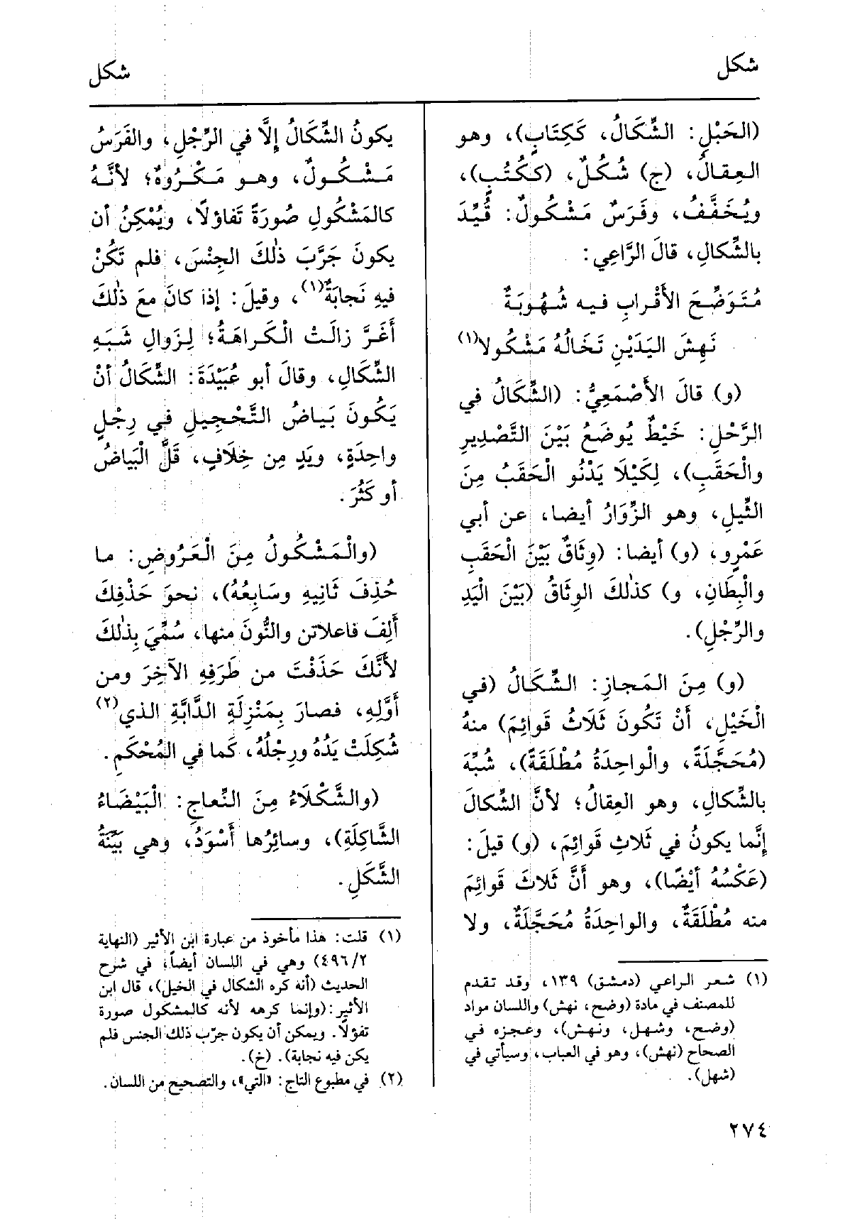 والمَشْكُولُ مِنَ الْعَرُوضِ: مَا حُذِفَ ثَانِيهِ وسابِعُهُ، نحوَ حَذْفِكَ أَلِفَ فاعلاتن والنُّونَ مِنْهَا، سُمِّيَ بِذلَ لأنَّكَ حَذَفْتَ من طَرَفِهِ الآخِرَ وَمن أَوَّلِهِ، فصارَ بِمَنْزِلَةِ الدَّابَّةِ الذِي شُكِلَتْ يَدُهُ ورِجْلُهُ، كَمَا فِي المُحْكَمِ. والشِّكْلاءُ مِنَ النِّعاجِ: الْبَيْضَاءُ الشَّاكِلَةِ، وسائِرُها أَسْوَدُ، وَهِي بَيِّنَةُ الشَّكْلِ.