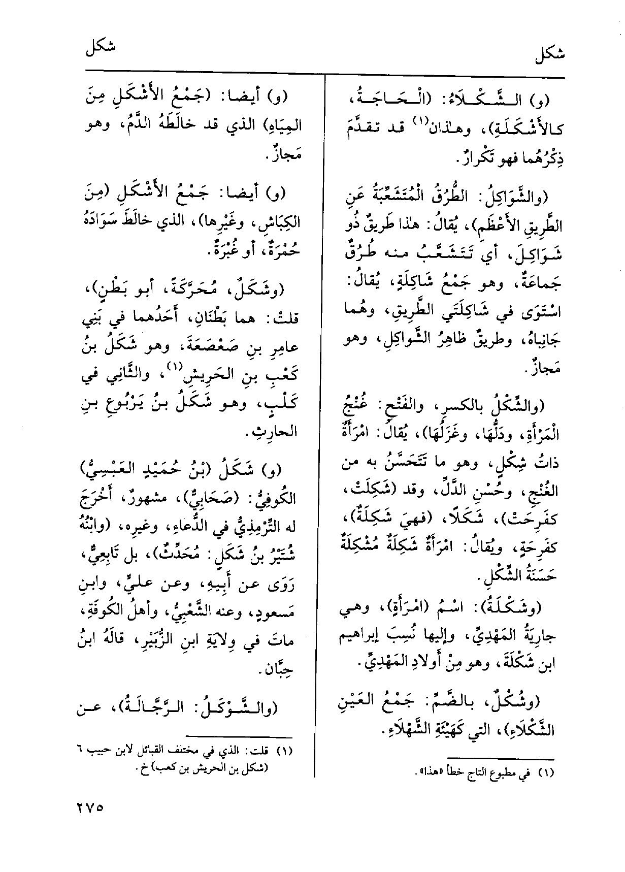 وَأَيْضًا: جَمْعُ الأَشْكَلِ مِنَ المِيَاهِ الَّذِي قد خالَطَهُ الدَّمُ، وَهُوَ مَجازٌ. وَأَيْضًا: جَمْعُ الأَشْكَلِ مِنَ الكِبَاشِ، وغَيْرِها، الَّذِي خالَطَ سَواَدُ حُمْرَةٌ، أَو غُبْرَةٌ. وشَكَلٌ، مُحَرَّكَةً، أَبُو بَطْنٍ، قلتُ: هما بَطْنانِ، أَحَدُهما فِي بَنِي عامِرِ بنِ صَعْصَعَةَ، وَهُوَ شَكَلُ بنُ كَعْبِ بنِ الحَرِيشِ، والثَّانِي فِي كَلْبٍ، وَهُوَ شَكَلُ بنُ يَرْبُوعِ بن الحارِثِ. وشَكَلُ بنُ حُمَيْدٍ العَبْسِيُّ الكُوفِيُّ: صَحَابِيٌّ، مَشْهُورٌ، أَخْرَجَ لَهُ التِّرْمِذِيُّ فِي الدُّعاءِ، وغيرِه، وابْنُهُ شُتَيْرُ بنُ شَكَلٍ: مُحَدِّثٌ، بل تَابِعِيٌّ، رَوَى عَن أَبِيهِ،)