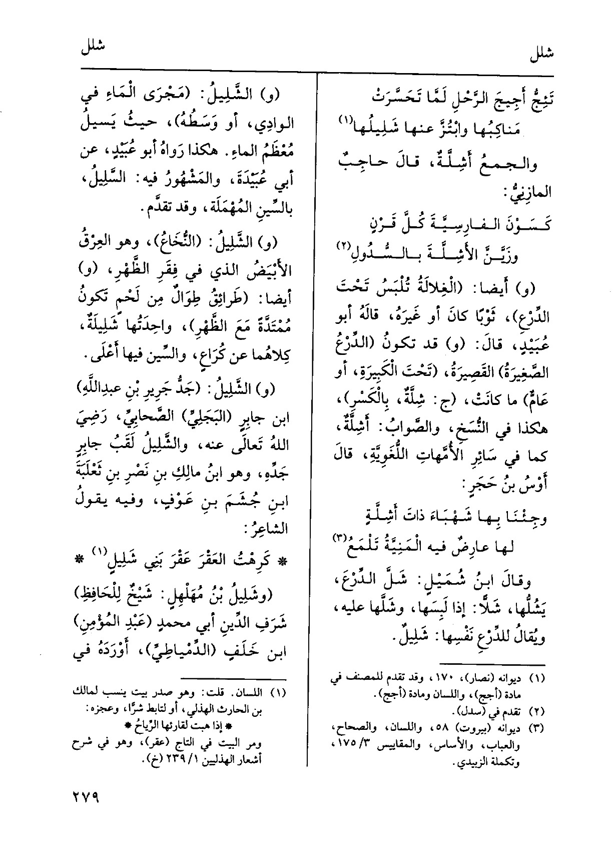 (و) {الشَّلِيلُ: مَجْرَى الْماءِ فِي الوادِي، أَو وَسَطُهُ، حيثُ يَسِيلُ مُعْظَمُ الماءِ. هَكَذَا رَواهُ أَبُو عُبَيْدٍ، عَن أبي عُبَيْدَةَ، والمَشْهُورُ فِيهِ: السَّلِيلُ، بالسِّينِ المُهْمَلَة، وَقد تقدَّم. والشَّلِيلُ: النُّخَاعُ، وَهُوَ العِرْقُ الأَبْيَضُ الَّذِي فِي فِقَرِ الظَّهْرِ، وَأَيْضًا: طَرائِقُ طِوَالٌ من لَحْمٍ تَكونُ مُمْتَدَّةً مَعَ الظَّهْرِ، واحِدَتُها شَلِيلَةٌ، كِلاهُما عَن كُرَاعٍ، والسِّين فِيهَا أَعْلَى. والشَّلِيلُ: جَدُّ جرِيرِ بن عبد اللهِ ابْن جابِرٍ البَجَلِيِّ الصَّحابِيِّ، رَضِيَ اللهُ تَعالَى عَنهُ، والشَّلِيلُ لَقَبُ جابِرٍ جَدّهِ، وَهُوَ ابنُ مالِكِ بنِ نَصْرِ بن ثَعْلَبَةَ ابنِ جُشَمَ بنِ عَوْفٍ، وَفِي يقولُ الشاعِرُ: كَرِهْتُ العَقْرَ عَقْرَ بَنِي شَلِيلٍ} وشَلِيلُ بْنُ مُهَلْهِلٍ: شَيْخٌ لِلْحَافِظِ شَرَفِ الدِّينِ أبي محمدٍ عَبْدِ المُؤْمِنِ ابْن خَلَفٍ الدِّمْياطِيِّ، أَوْرَدَهُ فِي