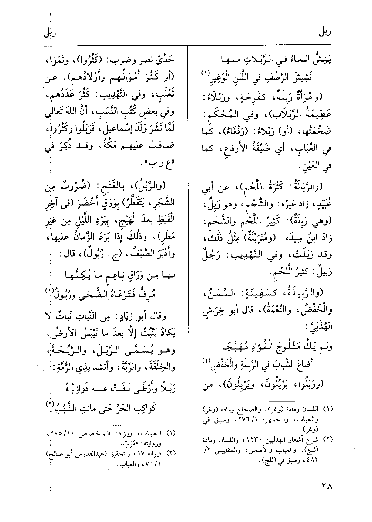 ورَبَلُوا، يَرْبُلُونَ، ويَرْبلُونَ، من حَدَّيْ نصر وَضرب: كَثُرُوا، ونَمَوْا، أَو كَثُرَ أَمْوَالُهم وأوْلادُهم، عَن ثَعْلَبٍ، وَفِي التَّهْذِيب: كَثُرَ عَدَدُهم، وَفِي بعضِ كُتُبِ النَّسَبِ، أنَّ اللهَ تَعالى لَمَّا نَشَرَ وَلَدَ إسْماعيلَ، فَرَبَلُوا وكَثُرُوا، ضاقتْ عَلَيْهِم مَكَّةُ، وَقد ذُكِرَ فِي ع ر ب. والرَّبْلُ، بالفَتْحِ: ضُرُوبٌ مِن الشَّجَرِ، يَتَفَطَّرُ بِوَرَقٍ أَخْضَرَ فِي آخِرِ الْقَيْظِ بعدَ الْهَيْجِ، بِبَرْدِ اللَّيْلِ مِن غيرِ مَطَرٍ، وذلكَ إِذا بَرَدَ الزَّمانُ عَلَيْهَا، وأَدْبَرَ الصَّيْفُ، ج: رُبُولٌ، قَالَ: