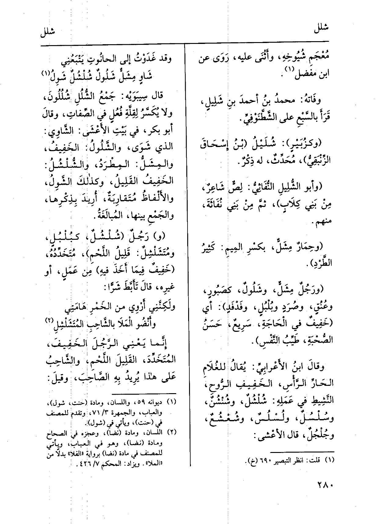 قَالَ سِيبَوَيْهِ: جَمْعُ {الشُّلُلِ} شُلُلُونَ، وَلَا يُكَسَّرُ لِقِلَّةِ فُعُلٍ فِي الصِّفاتِ، وقالَ أَبُو بكر، فِي بَيْتِ الأَعْشَى: الشَّاوِي: الَّذِي شَوَى، {والشَّلُولُ: الخَفِيفُ،} والمِشَلُّ: المِطْرَدُ، والشُّلْشُلُ: الخَفِيفُ القَلِيلُ، وكذلكَ الشَّوِلُ، والأَلْفاظُ مُتَقارِبَةٌ، أُرِيدَ بِذِكْرِها، والجَمْعِ بَينهَا، المُبالَغَةُ. ورَجُلٌ {شُلْشُلٌ، كبُلْبُلٍ،} ومُتَشَلْشِلٌ: قَلِيلُ اللَّحْمِ، مُتَخَدِّدُهُ، خَفِيفٌ فِيمَا أَخَذَ فيهِ مِن عَمَلٍ، أَو غيرِه، قالَ تَأَبَّطَ شَرَّاً: