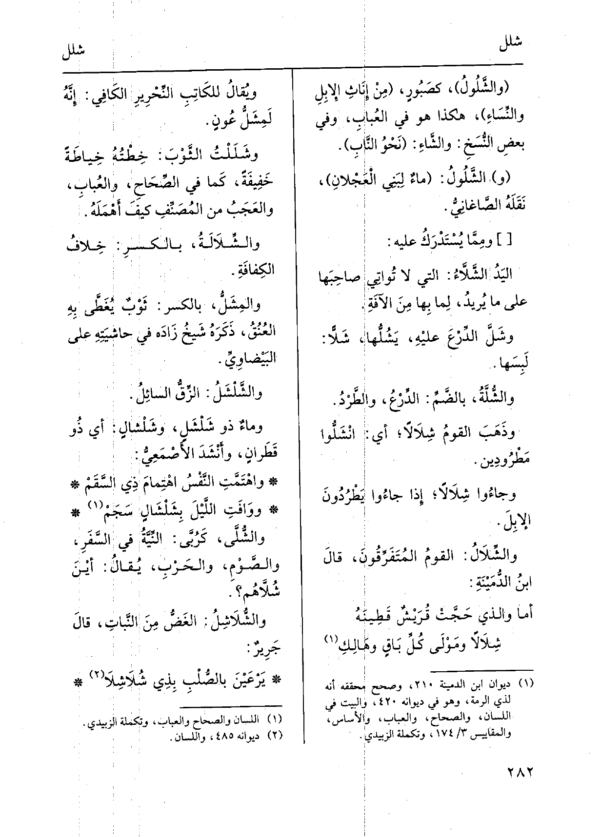 {والشَّلُولُ، كصَبُورٍ، مِنْ إِنَاثِ الإِبِلِ والنِّسَاءِ، هَكَذَا هُوَ فِي العُبابِ، وَفِي بعضِ النُّسَخِ: والشَّاءِ: نَحْوَ النَّابِ. (و) } الشَّلُولُ: ماءٌ لبَنِي الْعَجْلانِ، نَقَلَهُ الصّاغَانِيُّ. وممّا يُسْتَدْرَكُ عَلَيْهِ: اليَدُ {الشَّلاَّءُ: الَّتِي لَا تُواتِي صاحِبَها على مَا يُريدُ، لِما بِها مِنَ الآفَةِ.} وشَلَّ الدِّرْعَ عليْهِ، {يَشُلُّها،} شَلاًّ: لَبِسَها. {والشُّلَّةُ، بالضَّمِّ: الدِّرْعُ، والطَّرْدُ. وذَهَبَ القومُ) } شِلاَلاً، أَي: {انْشَلُّوا مَطْرُودِين. وجاءُوا} شِلاَلاً، إِذا جاءُوا يَطْرُدُونَ الإِبِلَ. {والشِّلاَلُ: القومُ المُتَفَرِّقُونَ، قالَ ابنُ الدُّمَيْنَةِ:
