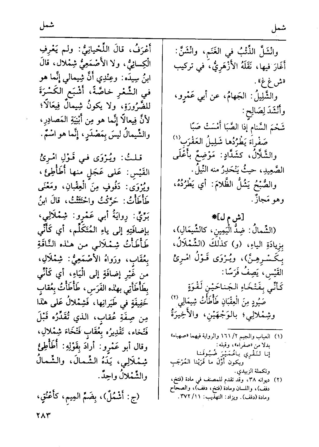 وشِمْلالِي، بالوَجْهَيْنِ، والأَخِيرَةُ أَعْرَفُ، قالَ اللِّحْيانِيُّ: وَلم يَعْرِفِ الْكِسائِيُّ، وَلَا الأَصْمَعِيُّ شِمْلال، قالَ ابنُ سِيدَه: عندِي أنَّ شِيمالِي إِنَّما هُوَ فِي الشِّعْرِ خاصَّةً، أَشْبَع الكَسْرَةَ للضَّرُورَةِ، وَلَا يكونُ شِيمالٌ فِيعَالاً، لأنّ فِيعالاً إِنَّما هُو من أَبْنِيَةِ المَصادِرِ، والشِّيمالُ ليسَ بِمَصْدَرٍ، إِنَّما هُوَ اسْمٌ. قلتُ: ويُرْوَى فِي قَوْلِ امْرِئِ القَيْسِ: عَلى عَجَلٍ مِنْهَا أُطَأْطِئُ، ويُرْوَى: دَفُوفٍ مِنَ العِقْبانِ، ومَعْنَى طَأْطَأْتُ: حَرَّكْتُ واحْتَثَثْتُ، قالَ ابنُ بَرِّيٍّ: رِوايَةُ أبي عَمْرٍ و: شِمْلاَلِي، بإِضافَتِهِ إِلَى ياءِ المُتَكَلِّم، أَي كَأَنِّي طَأْطَأْتُ شِمْلاَلِي من هَذِه النَّاقَةِ بِعُقَابٍ، ورَواهُ الأَصْمَعِيُّ: شِمْلاَلِ، من غَيْرِ إضافَةٍ إِلَى اليَاءِ، أَي كَأنِّي بِطَاْطَأَتِي بِهَذِهِ الفَرَسِ، طَأْطَأْتُ بِعُقابٍ خَفِيفَةٍ فِي طَيَرانِها، فَشِمْلالُ عَلى هَذَا مِن صِفَةِ عُقابٍ، الَّذِي تُقَدِّرُه قبلَ فَتْخاء، تَقْدِيرُه بِعُقَابٍ فَتْخاءَ شِمْللِ، وَقَالَ أَبُو عَمْرٍ و: أرادَ بِقَوْلِهِ: أُطَاْطِئُ شِمْلاَلِي، يَدَهُ الشِّمالَ، والشِّمالُ والشِّمْلالُ واحدٌ. ج: اَشْمُلٌ، بِضَمِّ المِيمِ، كأَعْنُقٍ،.