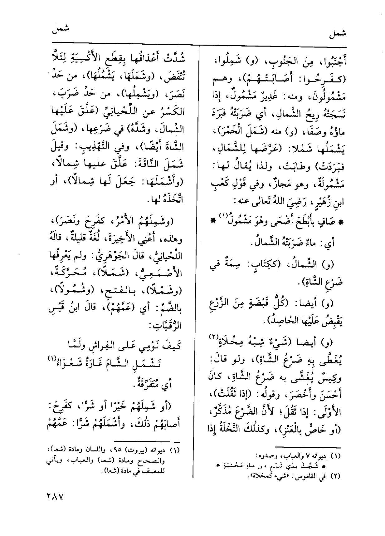 أَجْنَبُوا، مِنَ الجّنُوبِ، وشَمِلُوا، كفَرِحُوا: أَصَابَتْهُمْ، وهم مَشْمُولُونَ، وَمِنْه: غَدِيرٌ مَشْمُولٌ، إِذا نَسَجتْهُ رِيحُ الشَّمالِ، أَي ضَرَبَتْهُ فَبَرَدَ ماؤُهُ وصَفَا، وَمِنْه شَمَلَ الْخَمْرَ، يَشْمَلُها شَمْلاً: عَرَّضَها لِلشَّمالِ، فَبَرَدَتْ وطابَتْ، وَلذَا يُقالُ لَهَا: مَشْمُولَةٌ، وَهُوَ مَجازٌ، وَفِي قَوْلِ كَعْبِ ابنِ زُهَيْرٍ، رَضِيَ اللهُ تَعالى عَنهُ: صافٍ بأَبْطَحَ أَضْحَى وهْوَ مَشْمُولُ أَي: ماءٌ ضَرَبَتْهُ الشَّمالُ. والشِّمالُ، ككِتَابٍ: سِمَةٌ فِي ضَرْعِ الشَّاةِ. وَأَيْضًا: كُلُّ قَبْضَةٍ مِنَ الزَّرْعِ يَقْبِضُ عَلَيْها الحاصِدُ. وَأَيْضًا شَيْءٌ شِبْهُ مِخْلاَةٍ يُغَطَّى بِهِ ضَرْعُ الشَّاةِ، وَلَو قالَ: وكِيسٌ يُغْطَّى بِهِ ضَرْعُ الشَّاةِ، كانَ أَحْسَنَ وأخْصَرَ، وقولُه: إِذا ثَقُلَتْ، الأَوْلَى: إِذا ثَقُلَ، لأَنَّ الضَّرْعَ مُذَكَّرٌ، أَو خَاصٌّ بالْعَنْزِ، وكذلكَ النَّخْلَةُ إِذا شُدَّتْ أَعْذاقُها بِقِطَعِ الأَكْسِيَةِ لِئَلاَّ تُنْفَضَ، وشَمَلَهَا، يَشْمُلُهَا، من حَدِّ نَصَرَ، ويَشْمِلُها، من حَدِّ ضَرَبَ، الكَسرُ عَن اللِّحْيانِيِّ عَلَّقَ عَلَيْها الشِّمالَ، وشَدَّهُ فِي ضَرْعِها، وشَمَلَ الشَّاةَ أَيْضاً، وَفِي التَّهْذِيبِ: قيلَ شَمَلَ النَّاقَةَ: عَلَّقَ عَلَيْهَا شِمالاً، وأَشْمَلَهَا: جَعَلَ لَها شِمالاً، أَو اتَّخَذَهُ لَهَا. وشَمِلَهُمُ الأَمْرُ، كفَرِحَ ونَصَرَ، وَهَذِه، أَعْنِي الأَخِيرُة، لُغَةٌ قليلةٌ، قالَهُ اللِّحْيانِيُّ، قالَ الجَوْهَرِيُّ: وَلم يَعْرِفْها الأَصْمَعِيُّ، شَمَلاً، مُحَرَّكَةً، وشَمْلاً، بالفتحِ، وشُمُولاً، بالضَّمِّ: أَي عَمَّهُمْ، قالَ ابنُ قَيْسِ الرُّقَيَّاتِ:)