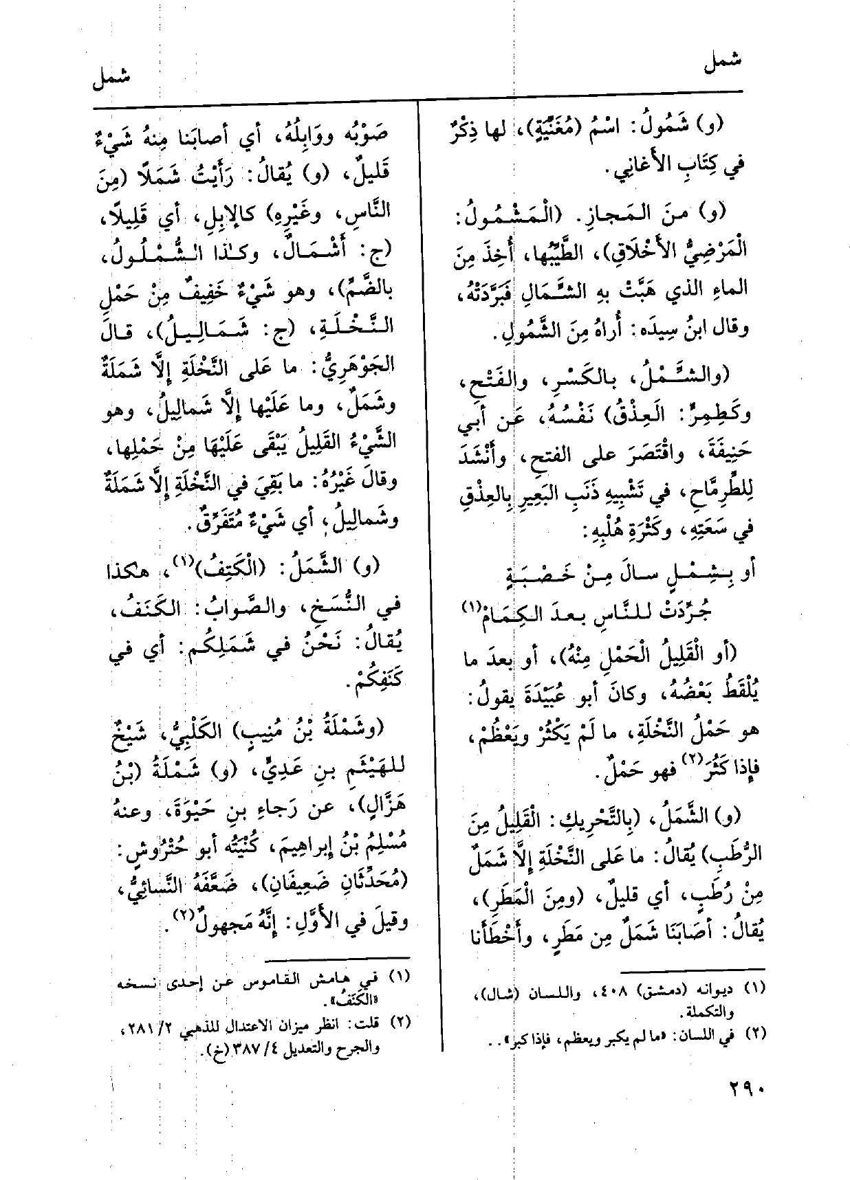 وشَمُولُ: اسْمُ مُغَنِّيَةٍ، لَهَا ذِكْرُ ف كِتَابِ الأَغانِي. ومنَ المَجازِ. الْمَشْمُولُ: الْمَرْضِيُّ الأَخْلاَقِ، الطَّيِّبُها، أُخِذَ مِنَ الماءِ الَّذِي هَبَّتْ بهِ الشِّمَالِ فَبَرَّدَتْهُ، وَقَالَ ابنُ سِيدَه: أَراهُ مِنَ الشَّمُولِ. والشِّمْلُ، بالكَسْرِ، والفَتْحِ، وكطِمِرٍ: العِذْقُ نَفْسُهُ، عَن أبي حَنِيفَةَ، واقْتَصَرَ عَلى الفتحِ، وأَنْشَدَ للطِّرِمَّاحِ، فِي تَشْبِهِ ذَنَبِ البَعِيرِ بِالعِذْقِ فِي سَعَتِهِ، وكَثْرَةِ هُلْبِهِ: