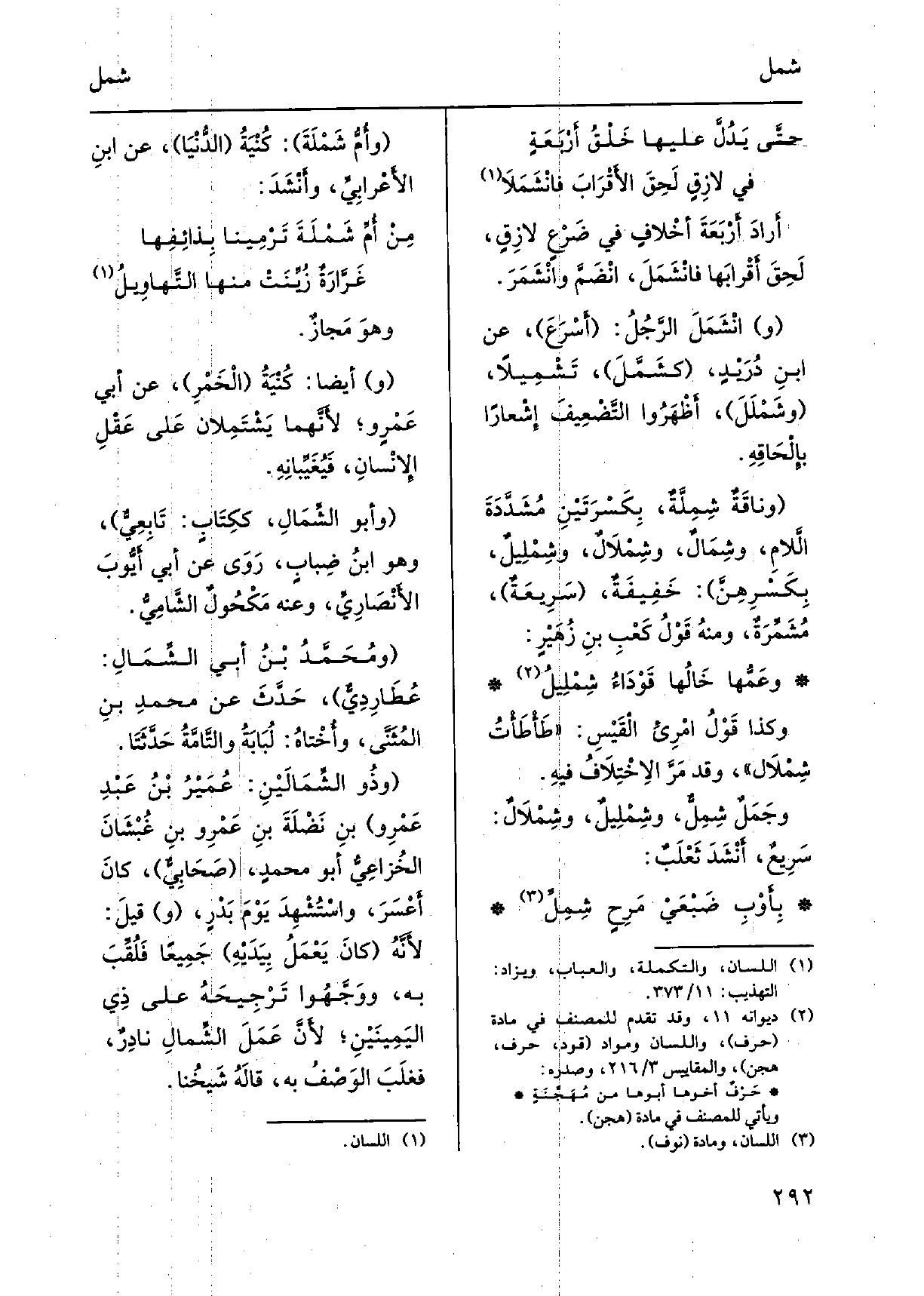 وَأَبُو الشِّمَالِ، كَكِتابٍ: تَابِعِيٌّ، وَهُوَ ابنُ ضِبابٍ، رَوَى عَن أبي أَيُّوبَ الأَنْصَارِيِّ، وَعنهُ مَكْحُولٌ الشَّامِيُّ. ومُحَمَّدُ بْنُ أبي الشِّمَالِ: عُطَارِدِيٌّ، حَدَّثَ عَن محمدِ بنِ المُثَنَّى، وأُخْتاهُ: لُبَابَةُ والتَّامَّةُ حَدَّثَتَا. وذُو الشِّمَالَيْنِ: عُمَيْرُ بْنُ عَبْدِ عَمْرِو بنِ نَضْلَةَ بنِ عَمْرِو بنِ غُبْشَانَ الخُزاعِيُّ أَبُو محمدٍ، صَحَابِيٌّ، كانَ أَعْسَرَ، واسْتُشْهِدَ يَوْمَ بَدْرٍ، وقيلَ: لأَنَّهُ كانَ يَعْمَلُ بِيَدَيْهِ جَمِيعاً فلُقِّبَ بِهِ، ووَجَّهُوا تَرْجِيحَهُ على ذِي اليَمِينَيْنِ، لأَنَّ عَمَل الشِّمالِ نادِرٌ، فغَلَبَ الوَصْفُ بِهِ، قالَهُ شَيْخُنا.