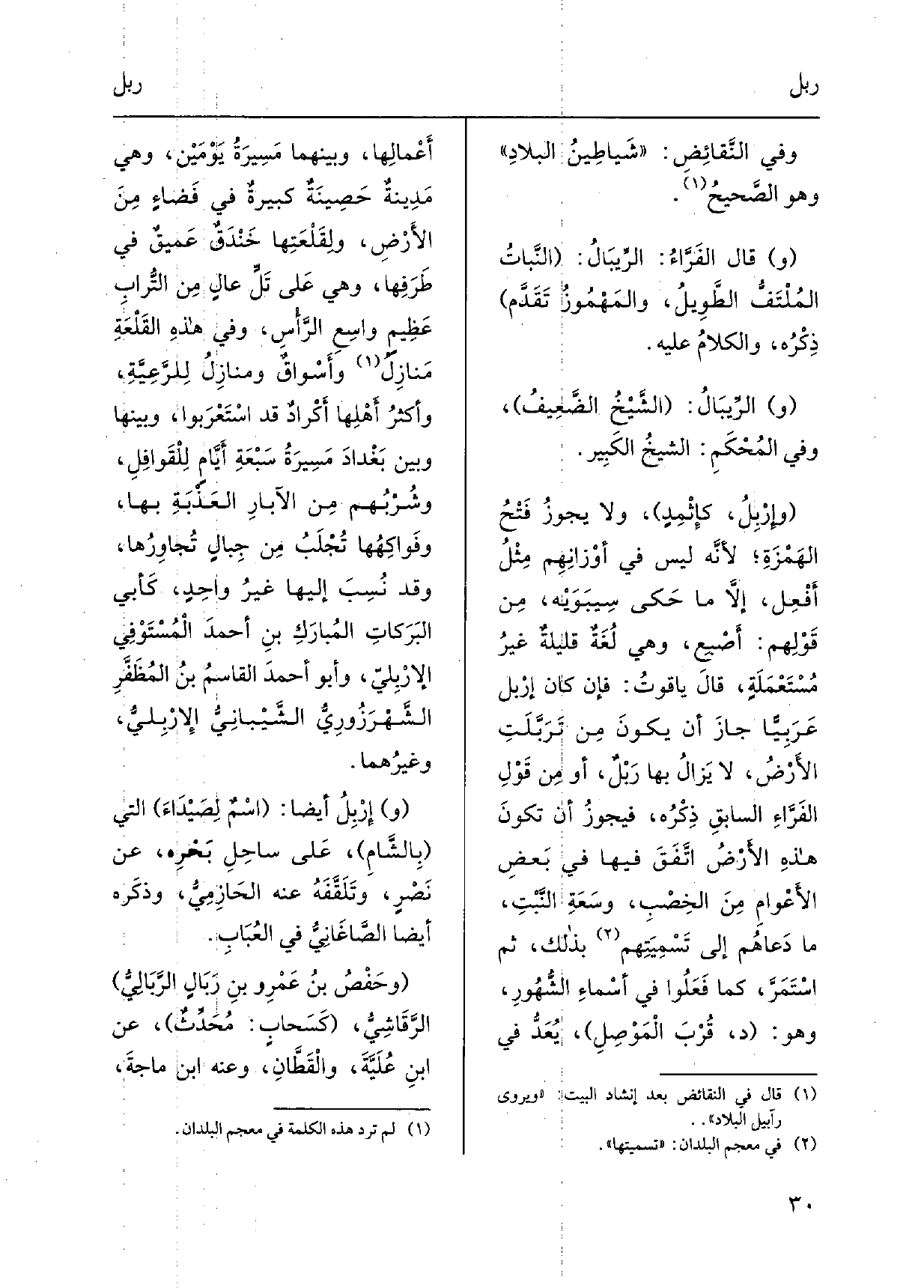وإِرْبِلُ، كإِثْمِدٍ، وَلَا يجوزُ فَتْحُ الهَمْزَةِ، لأنَّه لَيْسَ فِي أوْزانِهِم مِثْلُ أَفْعِل، إلاَّ مَا حَكى سِيبَوَيْه، مِن قَوْلِهم: أصْبِع، وَهِي لُغَةٌ قليلةٌ غيرُ مُسْتَعْمَلَةٍ، قالَ ياقوتُ: فَإِن كَانَ إرْبِل عَرَبِياً جازَ أَن يكونَ مِن تَرَبَّلَتِ الأَرْضُ، لَا يَزالُ بهَا رَبْلٌ، أَو مِن قَوْلِ الفَرَّاءِ السابقِ ذِكْرُه، فيجوزُ أَن تكونُ هَذِه الأرْضُ اتَّفَقَ فِيهَا فِي بَعْضِ الأَعْوامِ مِنَ الخِصْبِ، وسَعَةِ النَّبْتِ، مَا دَعاهُم إِلَى تَسْمِيَتِهم بذلك، ثمَّ اسْتَمَرَّ، كَمَا فَعَلُوا فِي أسْماءِ الشُّهُورِ، وَهُوَ: د، قُرْبَ الْمَوْصِلِ، يُعَدُّ فِي أَعْمالِها، وَبَينهمَا مَسِيرَةُ يَوْمَيْن، وَهِي مدِينةٌ حَصِينَةٌ كبيرةٌ فِي فَضاءٍ مِنَ الأَرْضِ، ولِقَلْعَتِها خَنْدَقٌ عَمِيقٌ فِي طَرَفِها، وَهِي عَلى تَلٍّ عالٍ مِن التُّرابِ عَظِيم واسِع الرَّأْسِ، وَفِي هَذِه القَلْعَةِ مَنازِلُ وأَسْواقٌ ومنازِلُ لِلرَّعِيَّةِ، وأكثرُ أَهْلِها أَكْرادٌ قد اسْتَعْرَبوا، وَبَينهَا وَبَين بَغْدادَ مَسِيرَةُ سَبْعَةِ أَيَّام لِلْقَوافِلِ، وشُرْبُهم من الآبارِ العَذْبَةِ بهَا، وفَواكِهُها تُجْلَبُ مِن جِبالٍ تُجاوِرُها، وَقد نُسِبَ إِلَيْهَا غيرُ واحِدٍ، كَأبي البَرَكاتِ المُبارَكِ بنِ أحمدَ الْمُسْتَوْفِي الإرْبِلِيّ، وَأَبُو أحمدَ القاسمُ بنُ المُظَفَّرِ الشَّهْرَزُورِيُّ الشَّيْبانِيُّ الإِرْبِليُّ، وغيرُهما. وإِرْبِلُ أَيْضا: اسْمٌ لِصَيْدَاءَ الَّتِي بِالشَّامِ، عَلى سَاحِلِ بَحْرِه، عَن) نَصْرٍ، وتَلَقَّفَهُ عَنهُ الحازِمِيُّ، وذكَره أَيْضا الصّاغَانِيُّ فِي العُبَابِ. وحَفْصُ بنُ عَمْرِو بنِ رَبَالٍ الرَّبَالِيُّ الرَّقَاشِيُّ، كَسَحابٍ: مُحَدِّثٌ، عَن ابنِ عُلَيَّةَ، والْقَطَّانِ، وَعنهُ ابْن ماجةَ،