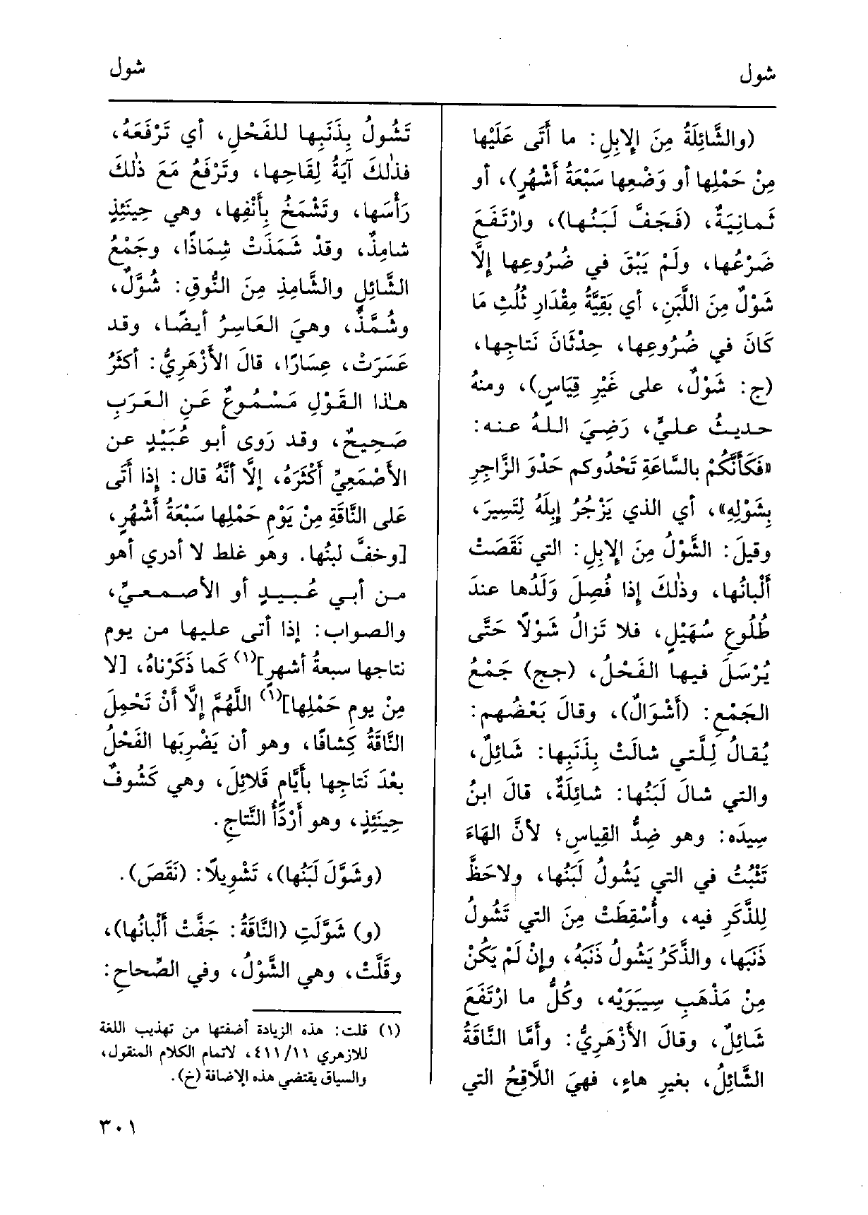 شامِذٌ، وقدْ شَمَذََتْ شِمَاذاً، وجَمْعُ {الشَّائِلِ والشَّامِذِ مِنَ النُّوقِ:} شُوَّلٌ، وشُمَّذٌ، وهيَ العَاسِرُ أَيْضا، وَقد عَسَرَتْ، عِسَاراً، قالَ الأَزْهَرِيُّ: أكثَرُ هَذَا القَوْلِ مَسْمُوعٌ عَنِ العَرَبِ صَحِيحٌ، وَقد رَوى أَبُو عُبَيْدٍ عَن الأَصْمَعِيِّ أَكْثَرَهُ، إلاَّ أَنَّهُ قَالَ: إِذا أَتَى عَلى النَّاقَةِ مِنْ يَوْمِ حَمْلِها سَبْعَةُ أشْهُرِ، وخَفَّ لبنُها. وَهُوَ غلط لَا أَدْرِي أهوَ من أبي عُبيدٍ أَو الأَصمعيِّ، وَالصَّوَاب: إِذا أَتَى عَلَيْهَا من يَوْم نتاجها سبعةُ أشهر، كَما ذَكَرناهُ، لَا مِنْ يَومِ حَمْلِها، اللَّهُمَّ إلاَّ أَنْ تَحْمِلَ النَّاقَةُ كِشافاً، وَهُوَ أَن يَضْرِبَها الفَحْلُ بعْدَ نَتاجِها بأيامٍ قَلائِلَ، وَهِي كَشُوفٌ حِينَئِذٍ، وَهُوَ أَرْدَأُ النَّتاجِ. {وشَوَّلَ لَبَنُها،} تَشْوِيلاً: نَقَصَ. (و) {شَوَّلَتِ النَّاقَةُ: جَفَّتْ أَلْبانُها، وقَلَّتْ، وَهِي} الشَّوْلُ، وَفِي الصِّحاحِ: