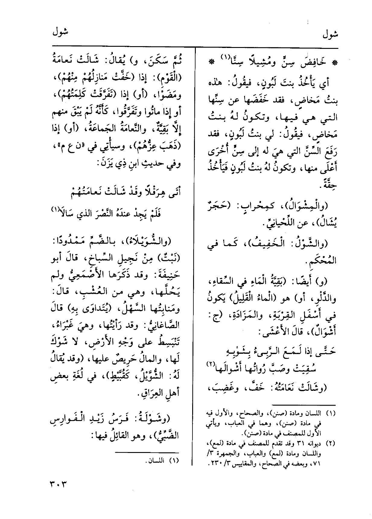 أَي يَأْخُذُ بنتَ لَبُونٍ، فيقُولُ: هَذِه بنتُ مَخاضٍ، فقد خَفَضَها عَن سِنِّها الَّتِي فِي فِيهَا، وتكونُ لهُ بنتُ مَخاضٍ، فيقُولُ: لي بنتُ لَبُونٍ، فقد رَفَعَ السِّنَّ الَّتِي هيَ لَهُ إِلَى سنِّ أُخْرَى أعْلَى مِنْهَا، وتكونُ لهُ بنتُ لَبُونٍ فَيأْخُذُ حِقَّةً.} والْمِشْوَالُ، كمِحْرابٍ: حَجَرٌ يُشَالُ، عَن اللِّحْيانِيِّ. {والشَّوْلُ: الْخَفِيفُ، كَما فِي المُحْكَمِ. وَأَيْضًا: بَقِيَّةُ الْمَاءِ فِي السِّقاءِ، والدَّلْوِ، أَو هُوَ الْماءُ الْقَلِيلُ يَكونُ فِي أسْفَلِ القِرْبَةِ، والمَزَادَةِ، ج:} أشْوَالٌ، قَالَ الأَعْشَى: