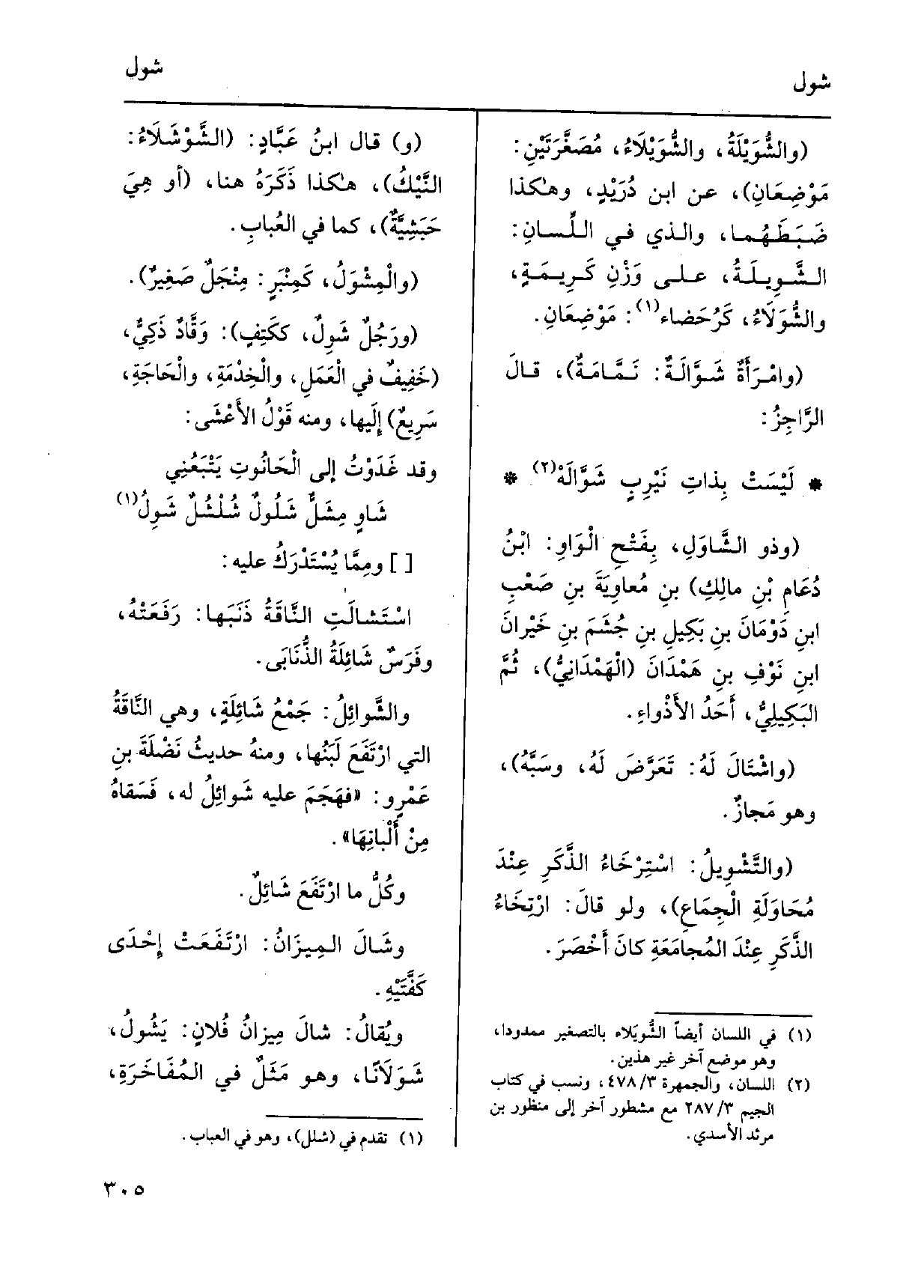 {والشُّوَيْلَةُ،} والشُّوَيْلاَءُ، مُصَغَّرَتَيْنِ: مَوْضِعَانِ، عَن ابْن دُرَيْدٍ، وَهَكَذَا ضَبَطَهُما، وَالَّذِي فِي اللِّسانِ: {الشَّوِيلَةُ، على وَزْنِ كَرِيمَةٍ،} والشُّوَلاَءُ، كَرُحَضاء: مَوْضِعَانِ. وامْرَأَةٌ {شَوَّالَةٌ: نَمَّامَةٌ، قالَ الرَّاجِزُ: لَيْسَتْ بِذاتِ نَيْرِبٍ} شَوَّالَهْ وَذُو {الشَّاوَلِ، بِفَتْحِ الْوَاوِ: ابْنُ دُعَامِ بنِ مالِكِ بنِ مُعاوِيَةَ بنِ صَعْبِ ابنِ دَوْمَانَ بنِ بَكِيلِ بنِ جُشَمَ بنِ خَيْرانَ ابنِ نَوْفِ بنِ هَمْدَانَ الهَمْدَانِيُّ، ثُمَّ البَكِيلِيُّ، أَحَدُ الأَذْواءِ.} واشْتَالَ لَهُ: تَعَرَّضَ لَهُ، وسَبَّهُ، وَهُوَ مَجازٌ. {والتَّشْوِيلُ: اسْتِرْخَاءُ الذّكَرِ عنْدَ مُحاوَلِةِ الجِمَاعِ، وَلَو قالَ ارْتِخاءُ الذّكَرِ عِنْدَ المُجامَعَةِ كانَ أَخْصَرَ. وَقَالَ ابنُ عَبّادٍ:} الشَّوْشَلاءُ: النَّيْكُ، هَكَذَا ذَكَرَهُ هُنَا، أَو هيَ حَبَشِيَّةٌ، كَمَا فِي العُبابِ. {والْمِشْوَلُ، كَمِنْبَرٍ: مِنْجَلٌ صَغِيرٌ. ورَجُلٌ} شَوِلٌ، ككَفٍ: وَقَّادٌ ذَكِيٌّ، خَفِيفٌ فِي الْعَمَلِ، والْخِدْمَةِ، والْحَاجَةِ، سَرِيعٌ أليْها، وَمِنْه قَوْلُ الأَعْشَى: